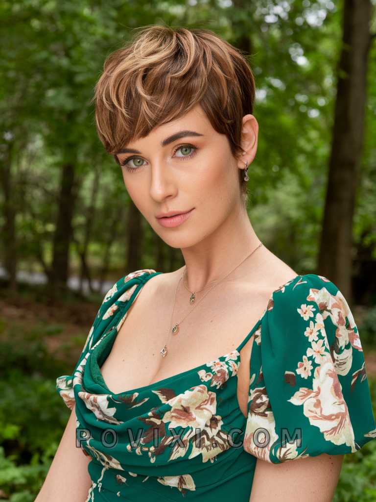 A chocolate brown pixie cut with light brown highlights brings a playful, modern twist to short hair. This style is perfect for creating volume and dimension, making it an ideal choice for oval and round faces. Brown or green eyes will stand out against the highlights, adding vibrancy to the look.