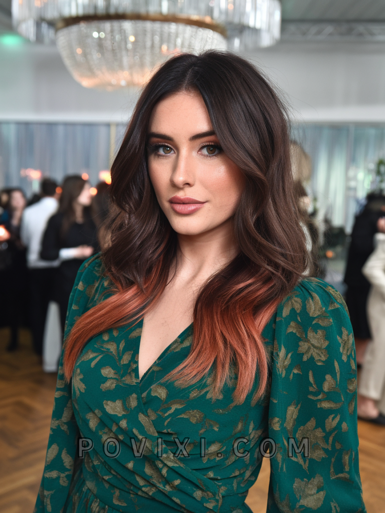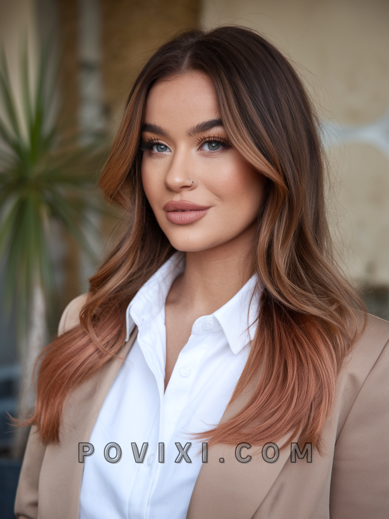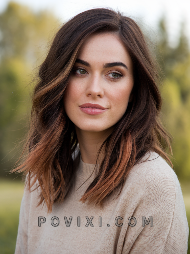 Adding deep copper highlights to chocolate brown hair creates a warm, autumnal feel that’s ideal for the colder months. This look is perfect for festive events or gatherings, adding a cozy, inviting depth to the hair. It suits square and heart-shaped faces and pairs well with hazel or brown eyes, enhancing the warmth of the overall look.