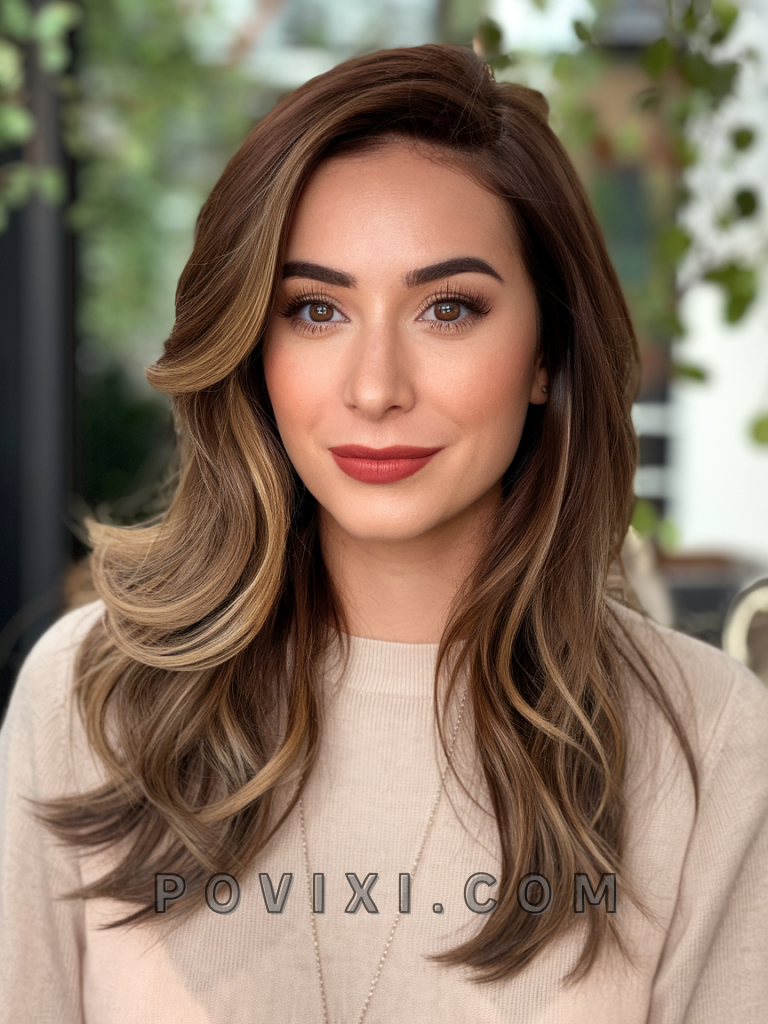 Long layers with a chocolate brown balayage bring depth and lightness in a subtle yet striking way. This style is perfect for casual outings or laid-back events, where a touch of elegance goes a long way. It’s ideal for oblong and square faces as the layers frame the face and soften strong features, while green or hazel eyes will pop against the rich, warm tones of the balayage.