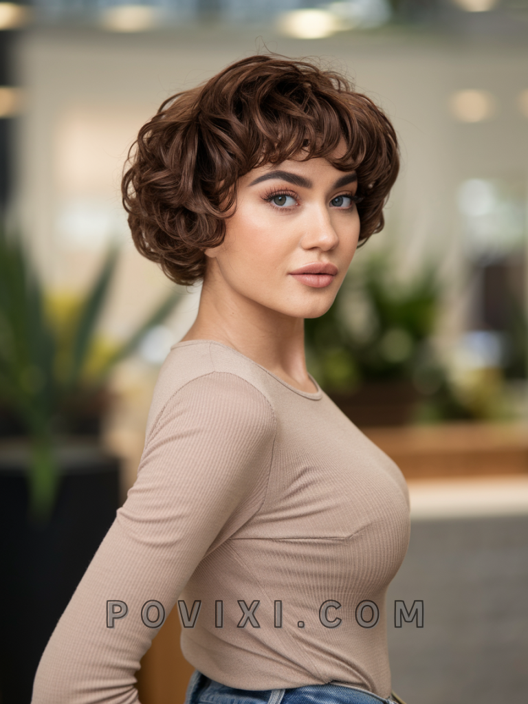 A short, curly chocolate brown cut offers volume and personality, embracing the natural texture of curly hair. This look is both playful and elegant, suitable for weekend brunches or evening dinners. The style complements round and oval faces and adds dimension to brown or green eyes, giving an effortlessly chic appearance that stands out.