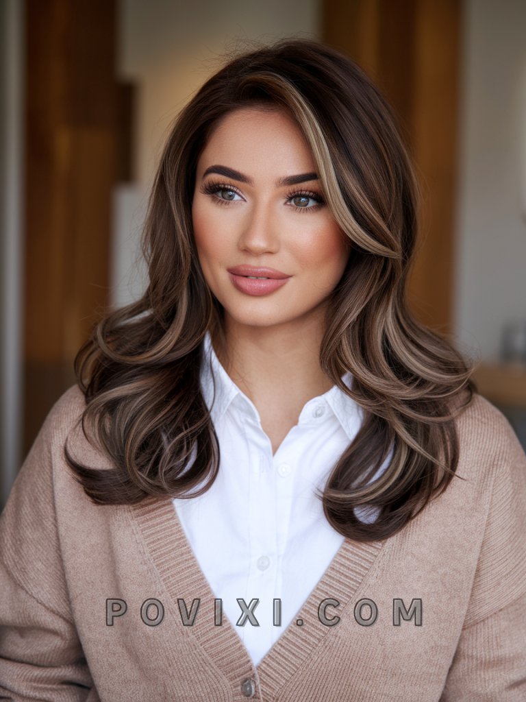 To create this look, ask for blonde highlights that are strategically placed around the face, with a gradual blend into your chocolate brown base. A deep-conditioning mask can help maintain the health and shine of the highlighted sections.