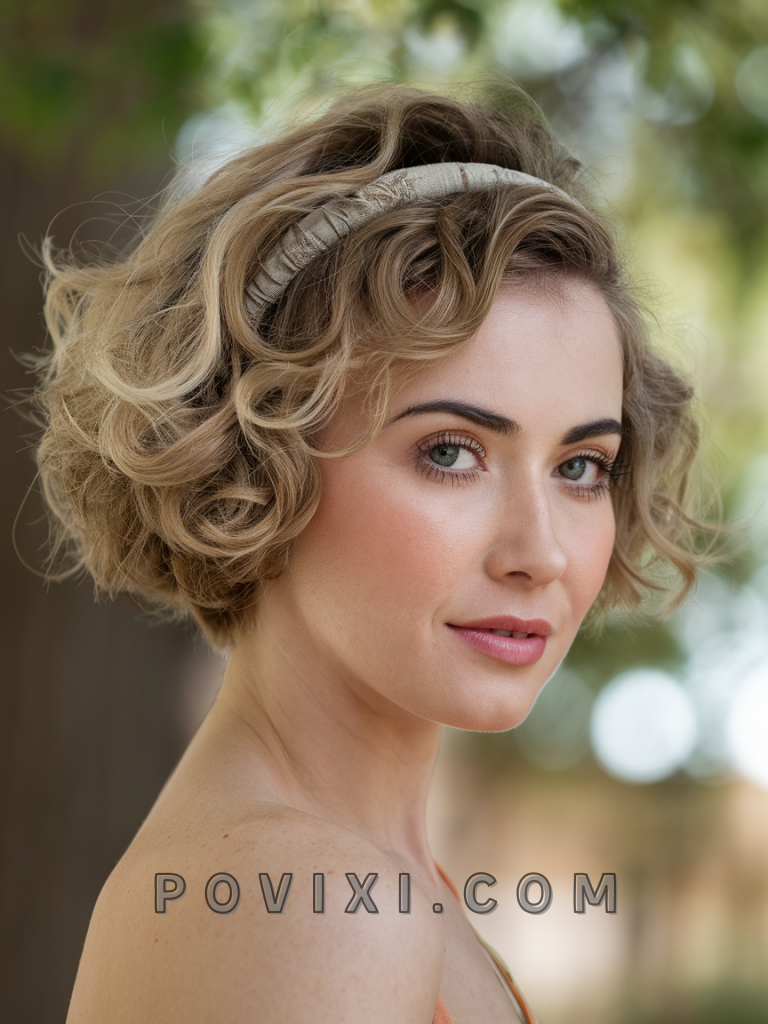 A short curly bob styled with a headband is a quick, cute, and practical option for casual days or sporty outings. The headband keeps the curls in place while adding a playful accessory. This style works well for all face shapes and is especially handy for busy mornings.