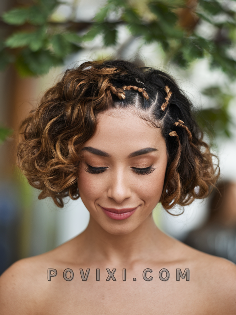 Incorporating twists into a short curly bob adds a stylish twist to the classic look. Twists frame the face beautifully while enhancing the natural texture of curls.  This hairstyle is ideal for black women embracing their natural hair and suits diamond and oval face shapes.