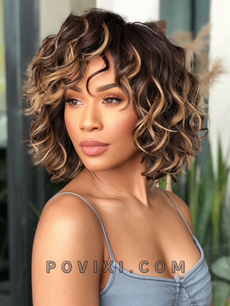 To create this look, add highlights using a balayage technique for a natural blend. Use a curl-enhancing product like DevaCurl SuperCream to define the curls, and deep condition weekly to keep highlighted hair hydrated and healthy.