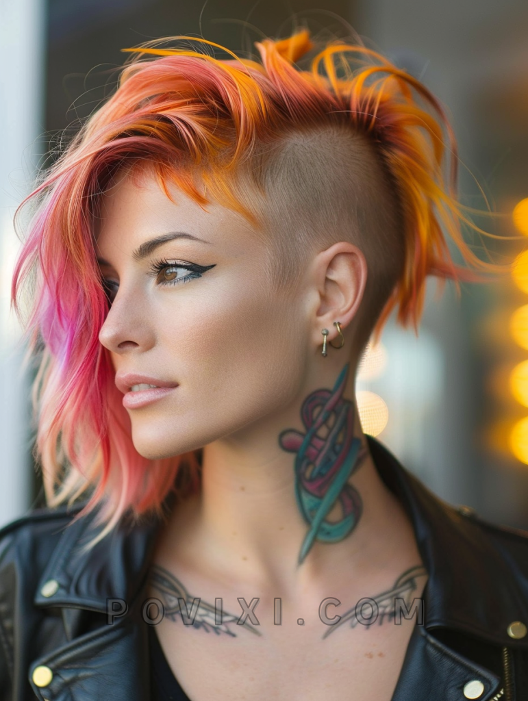 Creating this look involves a stylist skilled in both cutting and creative coloring techniques. Maintenance includes using color-protecting shampoos and conditioners to keep the hues vibrant and regular trims to maintain the shaved patterns. Styling products like hair wax or gel can help define and hold the patterns in place.
