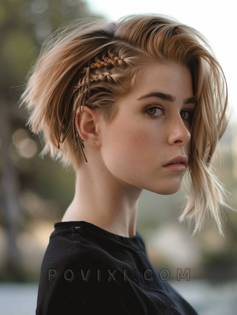 The braided undercut bob is a unique and stylish option that combines braids with an undercut. This style features braids on top with a hidden undercut, making it a perfect choice for festivals, parties, or creative events. It works well for oval and round face shapes.
