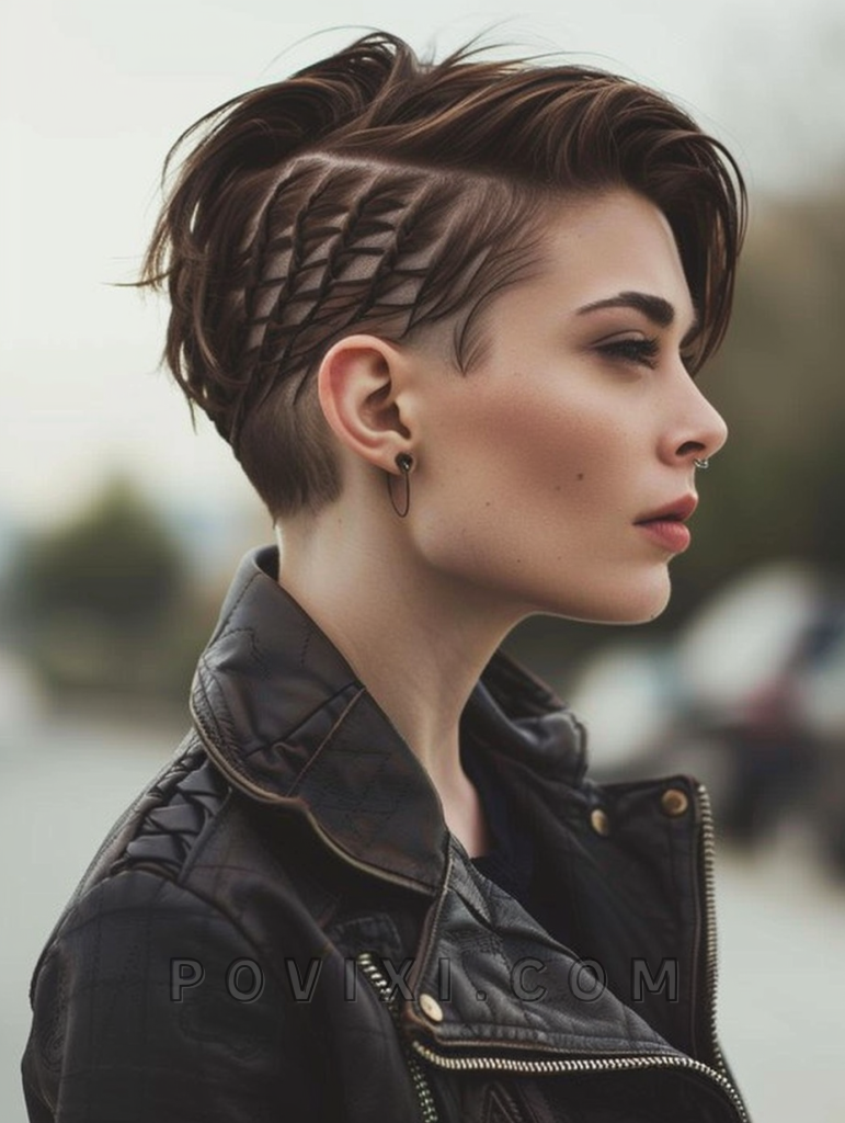 The undercut bob with a shaved design is for those who love to make a bold statement. This style features intricate shaved patterns in the undercut, combined with a sleek bob. It’s perfect for artistic and creative events, festivals, or parties and suits oval and square face shapes.