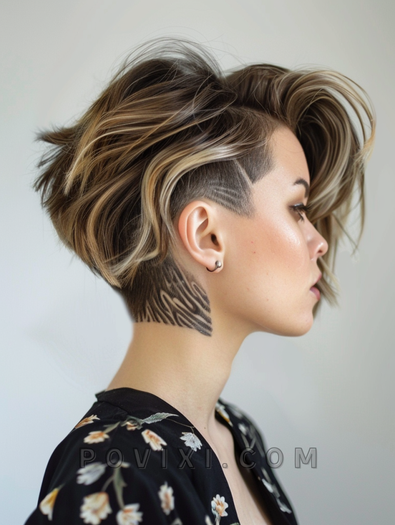 Achieving this look involves a stylist skilled in creating shaved designs. Maintenance includes using a smoothing serum for the bob and a light pomade to keep the shaved design sharp. Regular touch-ups are essential to maintain the shaved patterns and the overall shape.