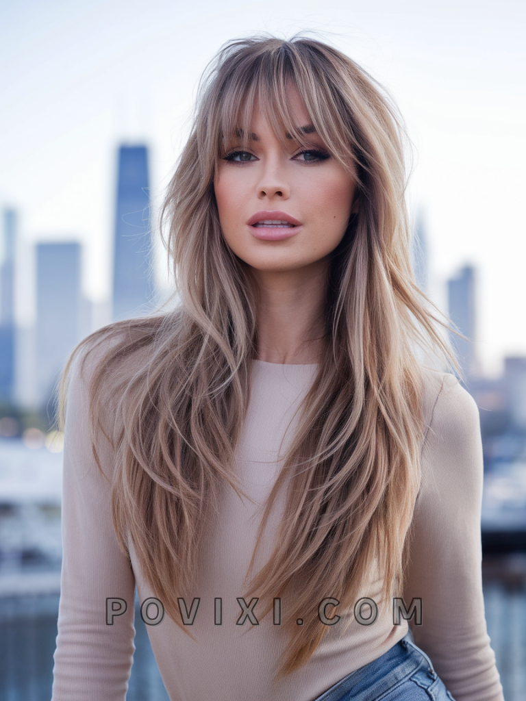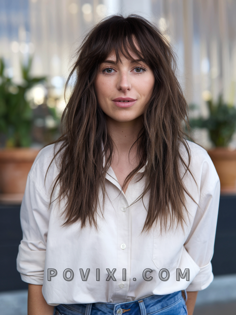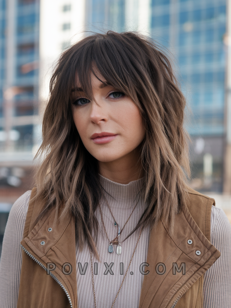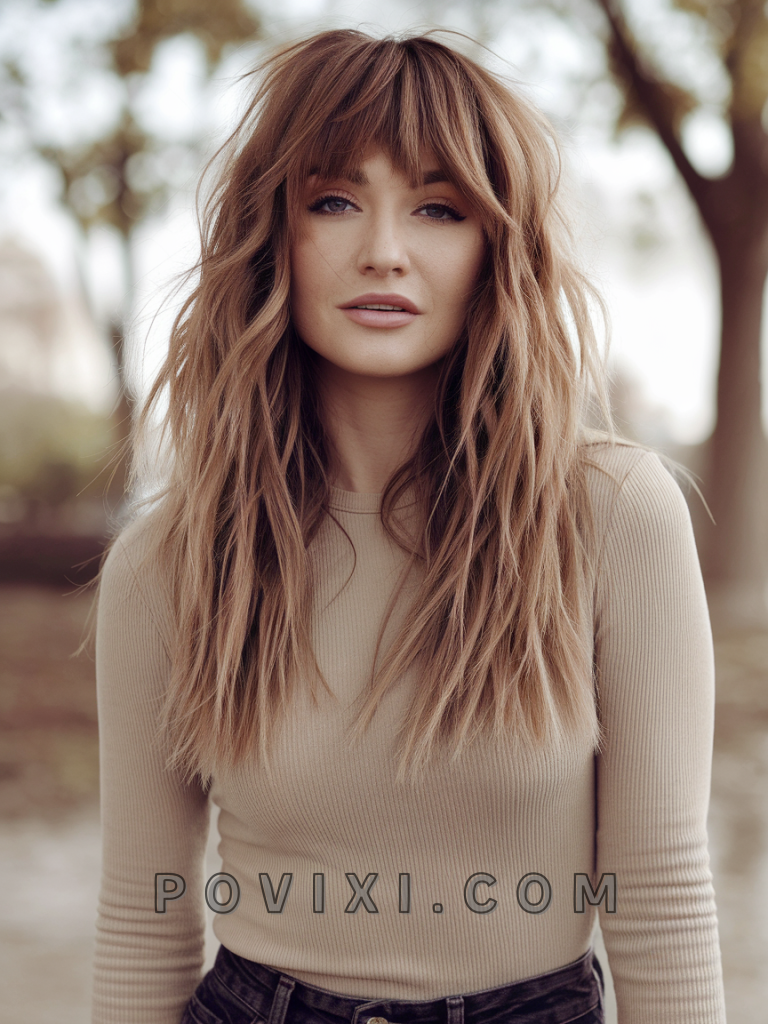 The curtain bangs with choppy layers combo is a bold, Y2K-inspired statement. The curtain bangs add softness, while the choppy layers bring edge, making it ideal for square or round faces. This playful look suits wavy hair and shines at casual gatherings or Indie-style concerts.