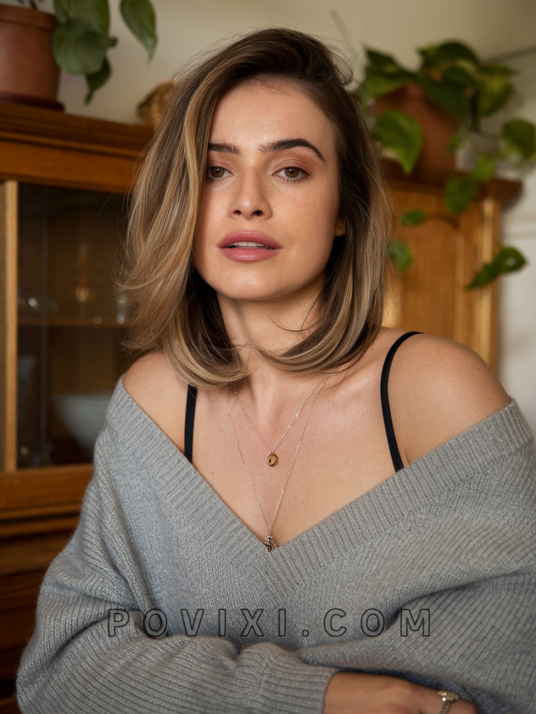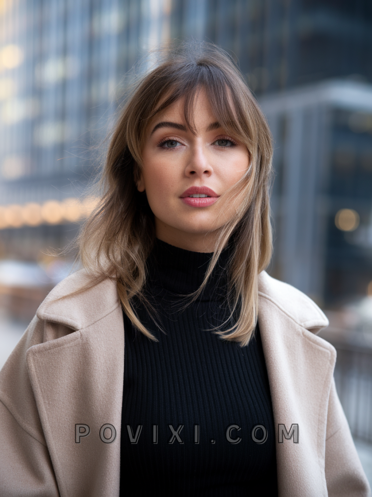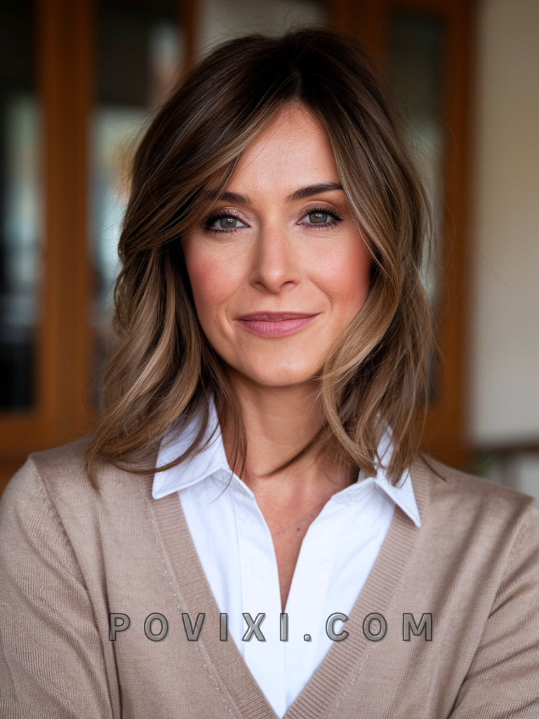 This shoulder-length style with side bangs is an epitome of elegance, suitable for both fine hair and thick hair. The side bangs create a flattering angle for heart-shaped and oval faces, while the layers add dimension. Perfect for 90’s-inspired parties or romantic dinners, this cut exudes timeless charm.