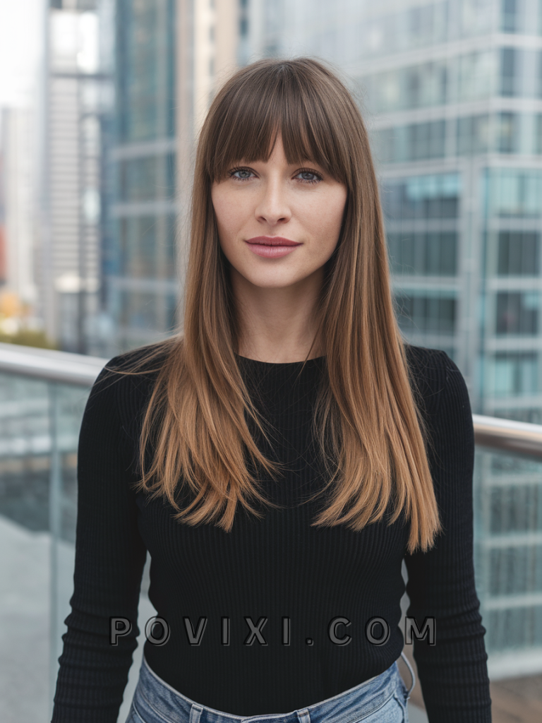 For sleek sophistication, opt for straight layers with bangs. This look suits medium hair and is best for oval or heart-shaped faces. Perfect for formal events or Indian weddings, it’s a polished style that radiates class.