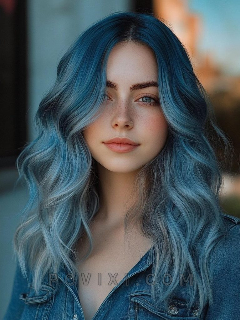 For those with long hair, long denim curls offer a romantic and feminine take on the denim blue trend. These loose curls cascade down the back, creating a soft and elegant look that’s perfect for special occasions or formal events. This style works beautifully with diamond and heart-shaped faces, as the curls help balance out sharper angles.