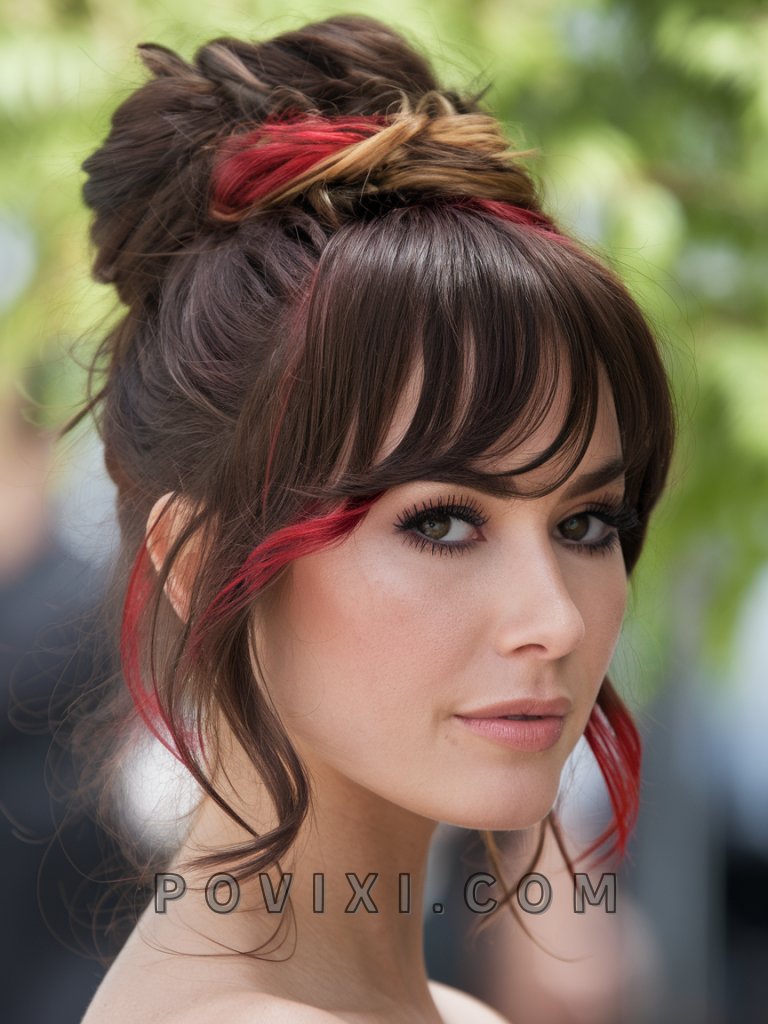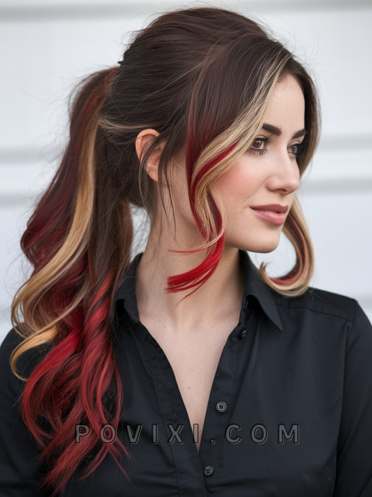 Peekaboo highlights are a perfect way to spice up your dark brown locks without a full commitment to bold color. These hidden streaks of vibrant hues, like red or blonde, come to life when you wear your hair in a ponytail or braid, making them ideal for spring, summer, or playful nights out. This edgy look suits all face shapes and adds a different dimension to both straight and curly hairstyles, especially for those with medium to long hair.