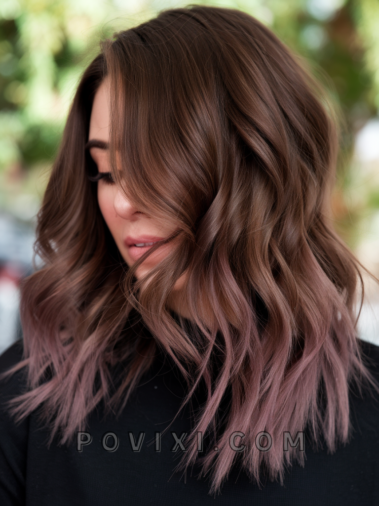 Chocolate mauve balayage is a trendy, muted tone that adds a touch of whimsy to dark brown hair. This shade is perfect for brunettes who want to experiment with color while keeping it subtle. It’s a fantastic choice for fall or winter parties, especially for medium to long hair.