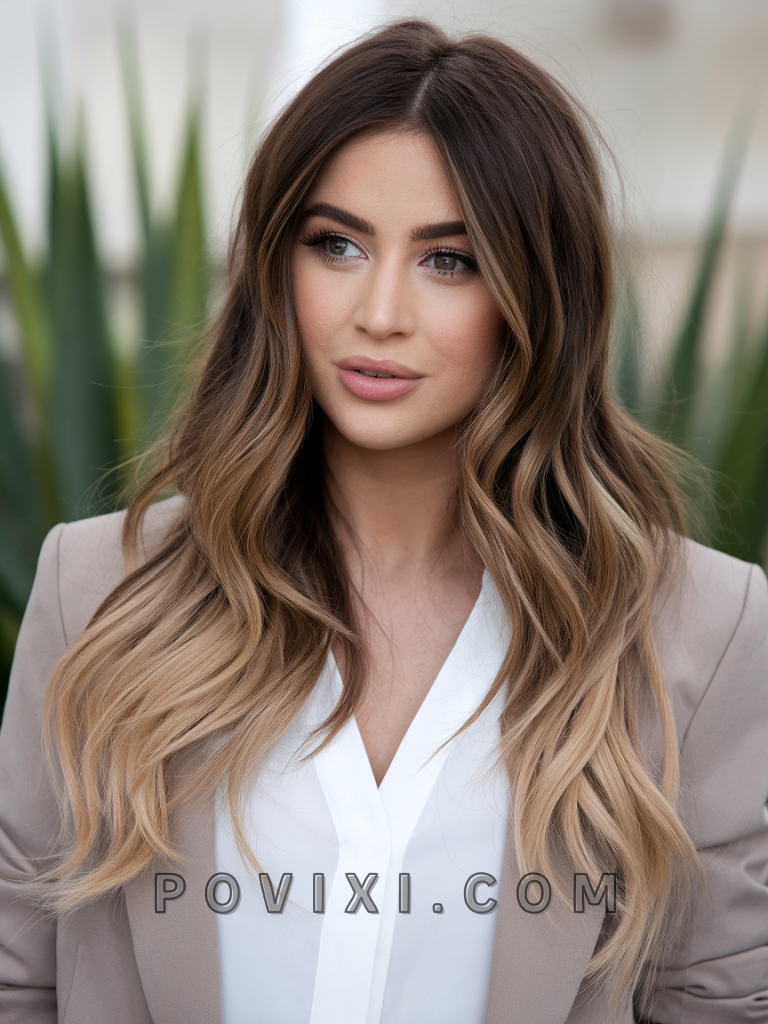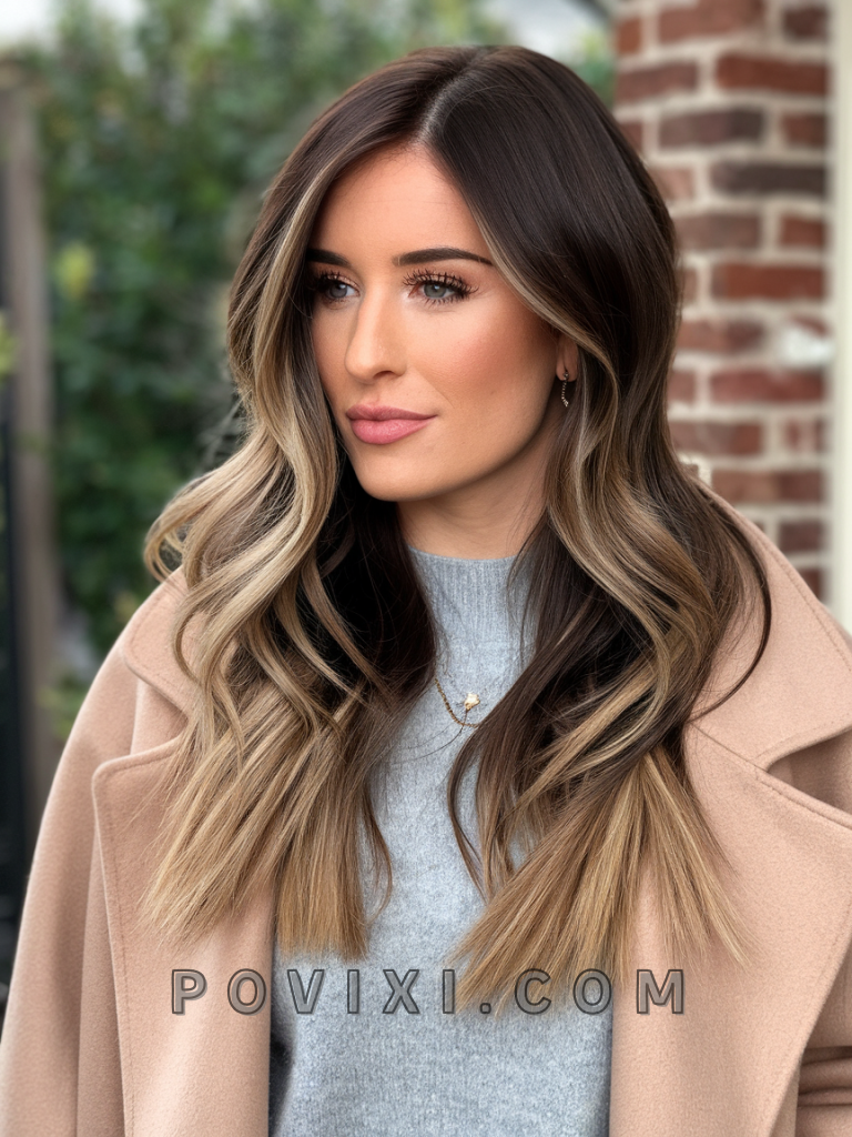 This style brings streaks of honey or ash blonde to dark brown hair, creating a luminous effect that’s playful yet elegant. It suits most face shapes and adds a radiant glow to olive or tan skin tones.