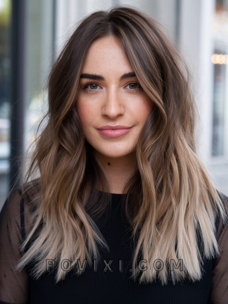 This look blends milk chocolate tones with soft blonde highlights, creating a luscious melted effect. It’s a playful yet sophisticated style perfect for summer and spring. It flatters oval and round faces and looks stunning on both long and medium hair.