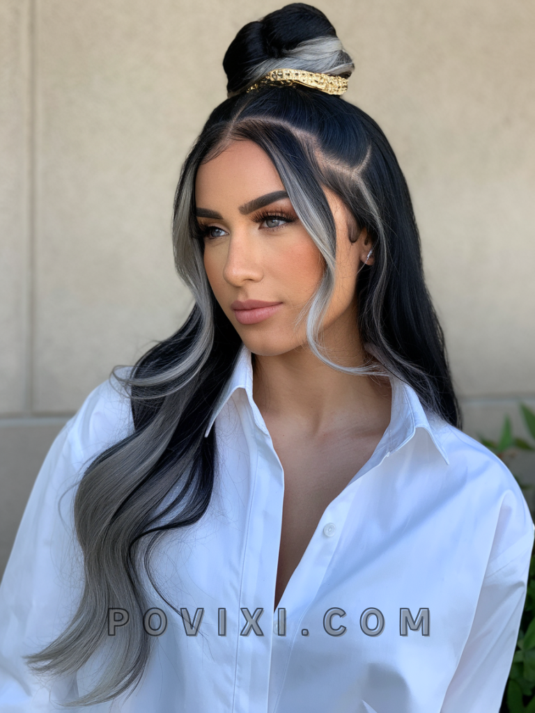 This style involves adding silver highlights to pre-lightened sections of black hair. A toning shampoo, like Redken Color Extend Graydiant, will keep the silver hues bright and prevent yellowing. Heat protectants are essential to maintain the integrity of the hair.