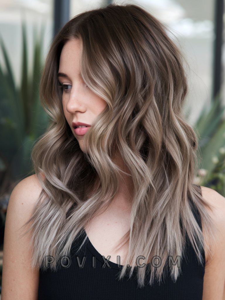 An icy brown balayage introduces cool, ash tones to a classic dark brown base, offering a modern and sophisticated vibe. This style is ideal for long, straight, or wavy hair and suits those with cool undertones in their skin. It’s a chic choice for professional environments and evening outings in the season of fall 2025.