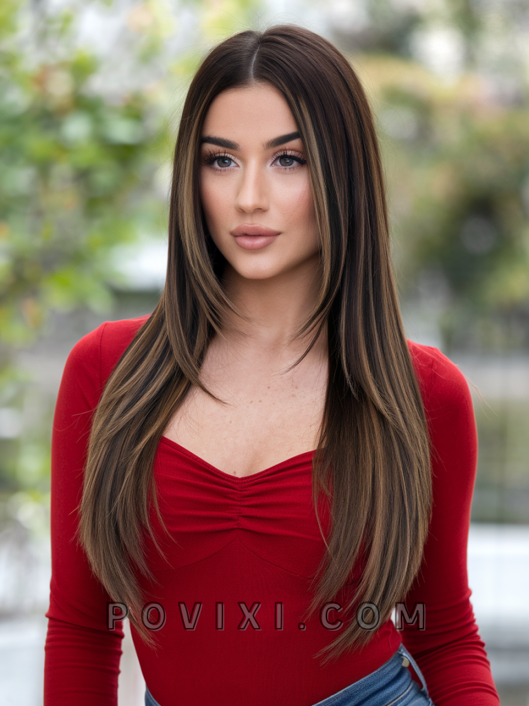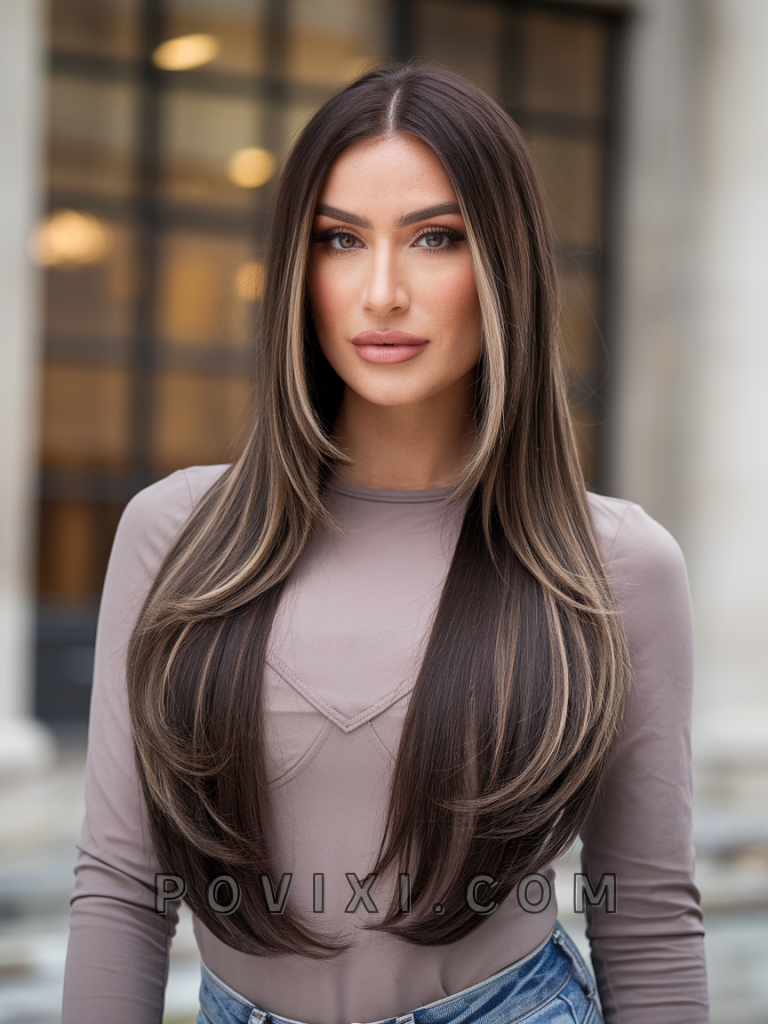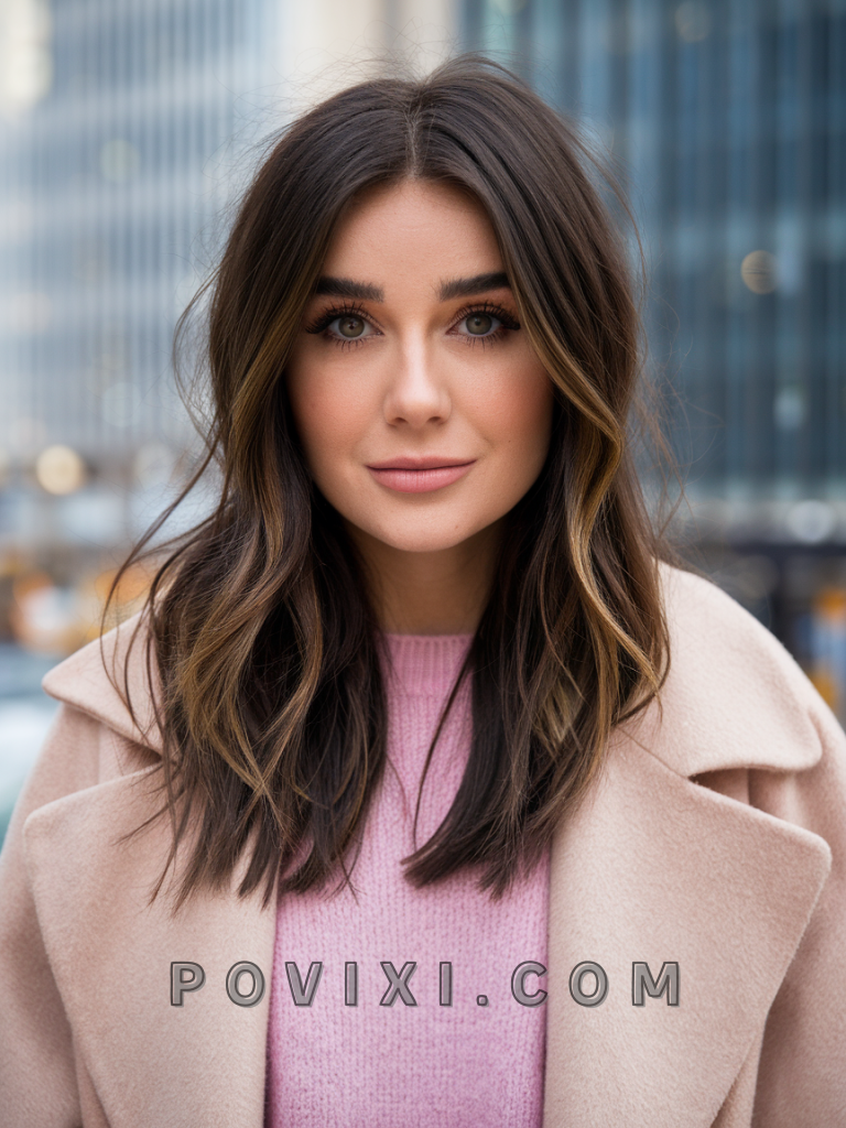 Sleek and simple, straight dark brown hair with subtle highlights is timeless and polished. This look is versatile, working for professional settings or casual weekends. It’s especially stunning on oval faces and brings out the depth of hazel or brown eyes.
