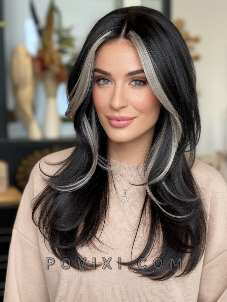 Long black hair with silver highlights offers a sleek and edgy aesthetic. The metallic accents give a futuristic touch, making this style perfect for fashion-forward brunettes in fall 2025. It works best for those with cool undertones and sharp, angular face shapes.