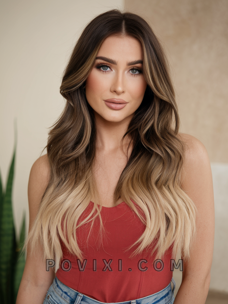The light brown ombre offers a smooth transition from dark brown roots to lighter tips, creating a sun-kissed effect that works year-round.