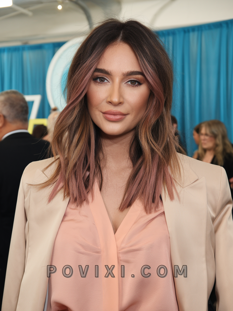 Medium brown hair with rose gold highlights offers a trendy, feminine touch for 2025. This warm combination is perfect for spring and fall, providing a fresh, radiant look that complements fair to medium skin tones. It’s ideal for those who want to experiment with color while keeping things soft and romantic.