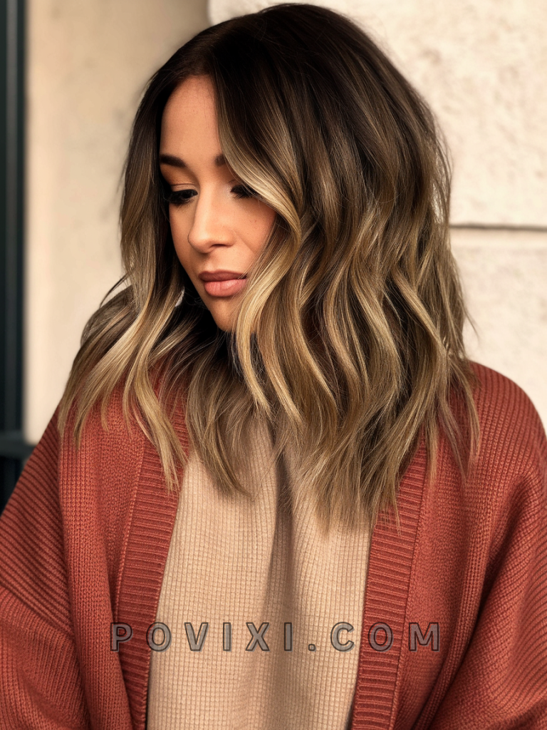 This style brings streaks of honey or ash blonde to dark brown hair, creating a luminous effect that’s playful yet elegant. It suits most face shapes and adds a radiant glow to olive or tan skin tones.