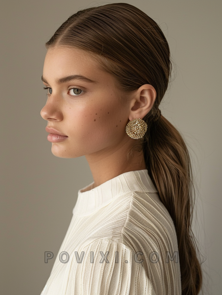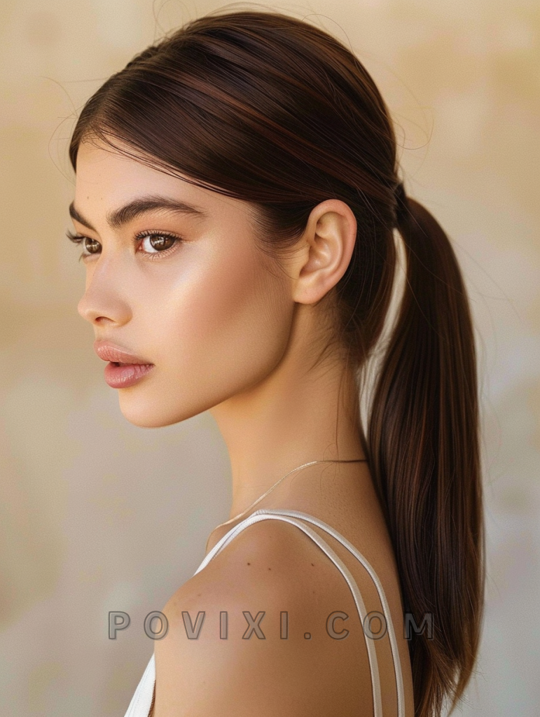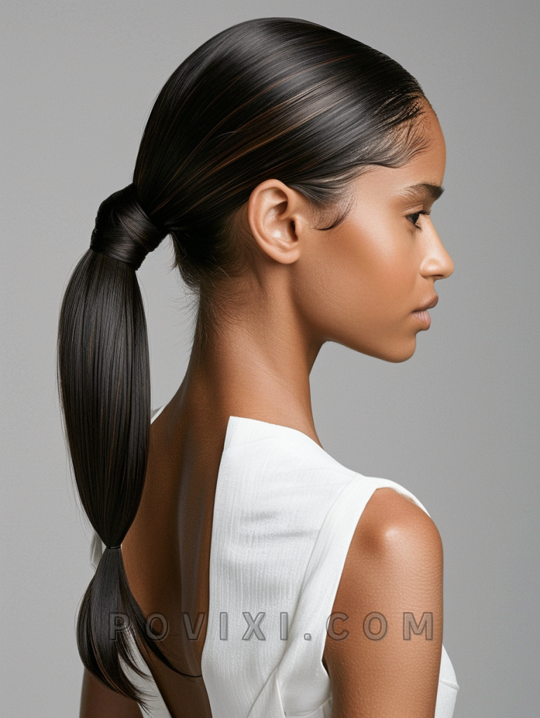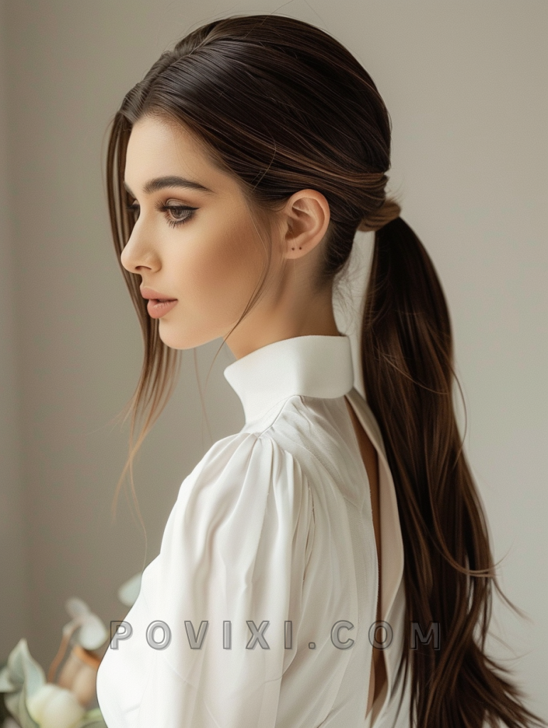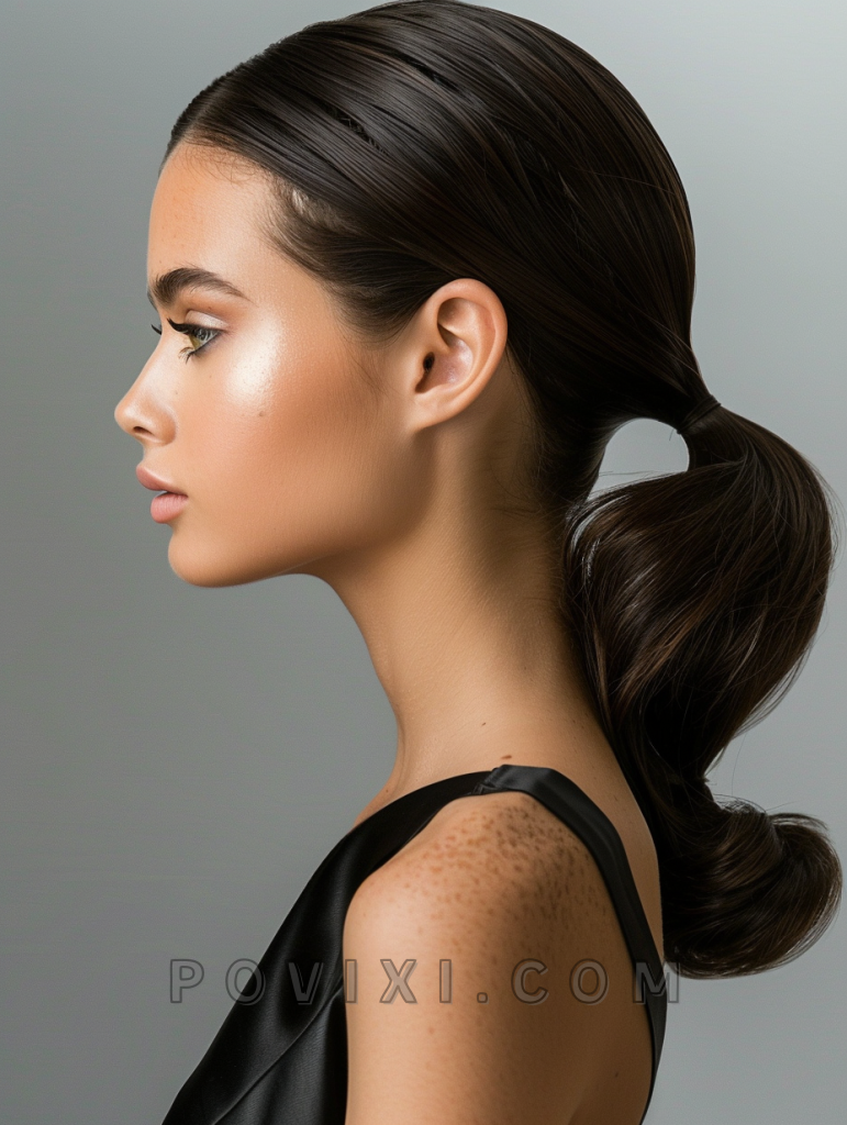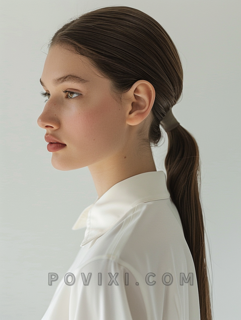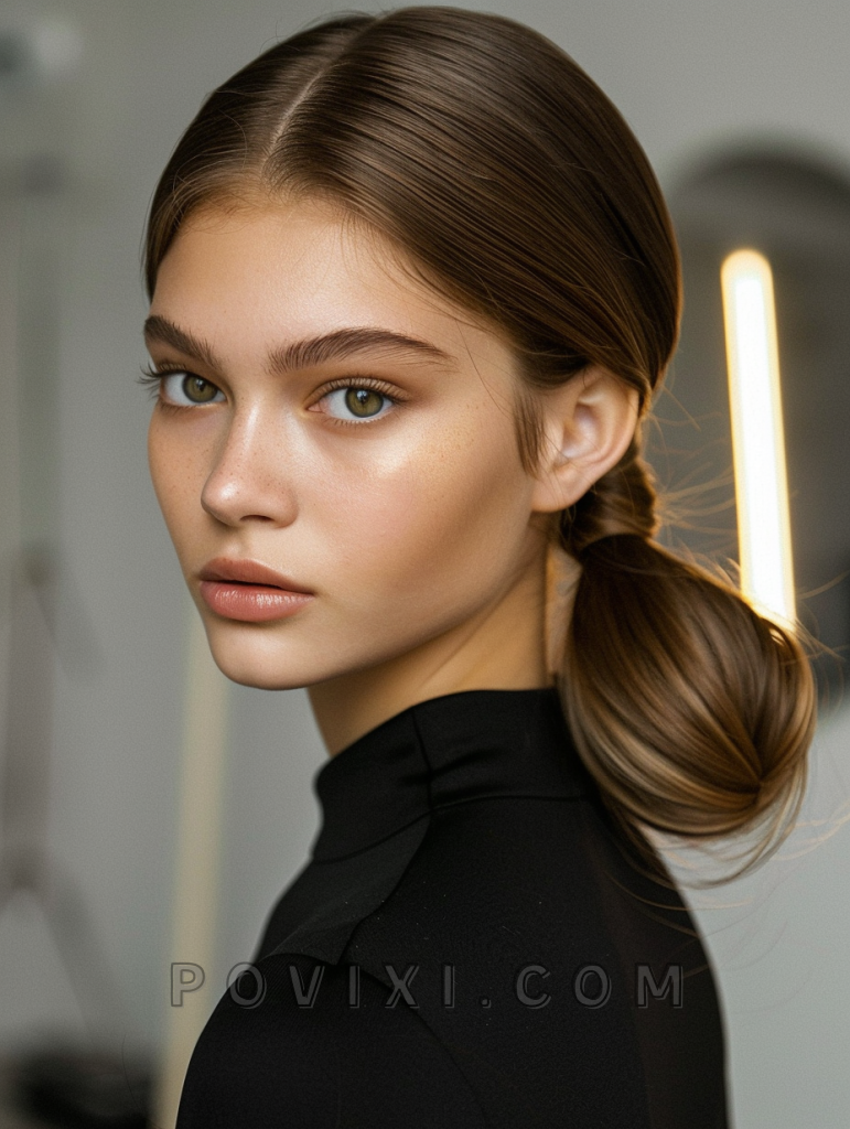 The classic low sleek ponytail exudes timeless elegance. This hairstyle involves pulling the hair back smoothly and securing it at the nape of the neck, creating a polished and sophisticated look. Ideal for formal events like weddings or galas, this style suits most face shapes, particularly oval and heart-shaped faces. It accentuates the eyes and jawline, making it a perfect choice for those with striking eye colors.