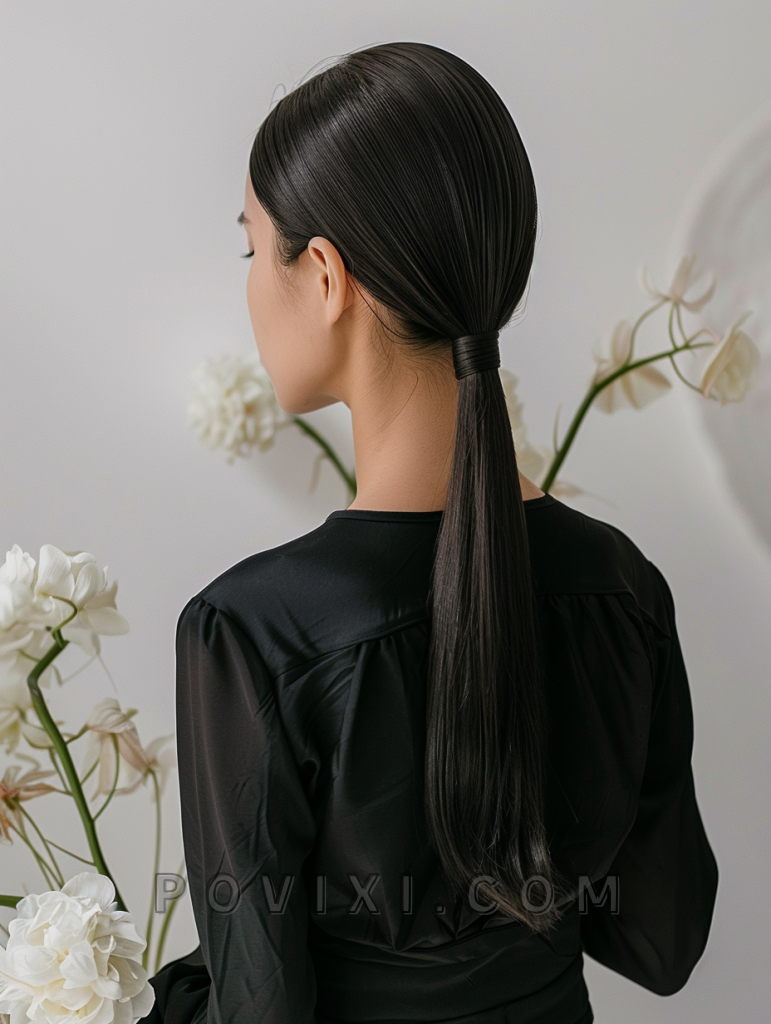 A middle part adds a classic and symmetrical look to the low sleek ponytail. This style is perfect for professional settings and formal events, offering a clean and polished appearance. It suits most face shapes, particularly oval and heart-shaped faces, and highlights the eyes and cheekbones.
