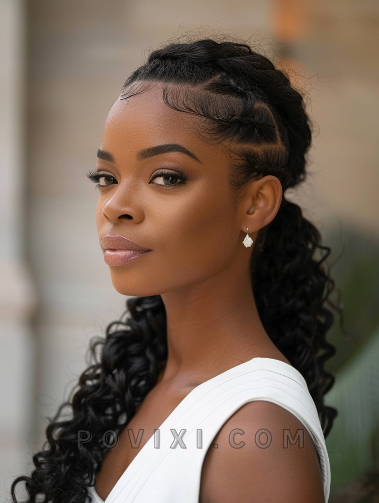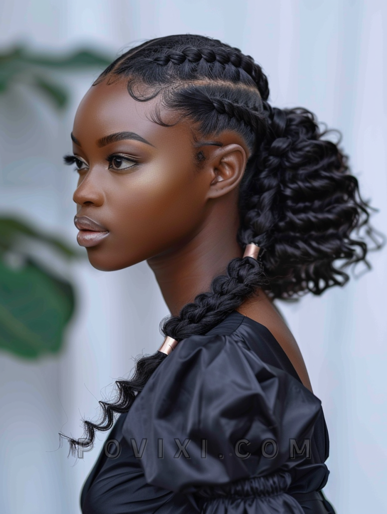 Attach a curly weave to your natural hair, smoothing the top section for a seamless blend. Gather your hair into a low ponytail at the nape of your neck and secure it with a hair tie. Allow the curls to cascade down one side, creating a stunning contrast with the sleek top. Use a curl-enhancing mousse and a light-hold hairspray to maintain the style.