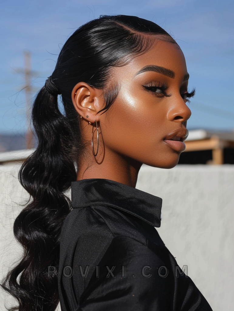 For those who love curls, the weave curly middle low sleek ponytail is an excellent choice. This style combines the sleekness of a low ponytail with the volume and texture of curly hair. It’s a fantastic option for adding drama and flair to your look, suitable for parties and special events.