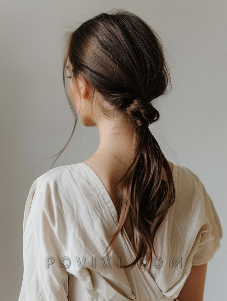Start by creating two small twists on each side of your head, starting from the temples and working your way back. Secure these twists at the nape of your neck. Smooth the rest of your hair into a low ponytail and secure it with a hair tie. Wrap a small section of hair around the base to conceal the tie. Use a shine-enhancing spray and a light-hold hairspray to maintain the style.