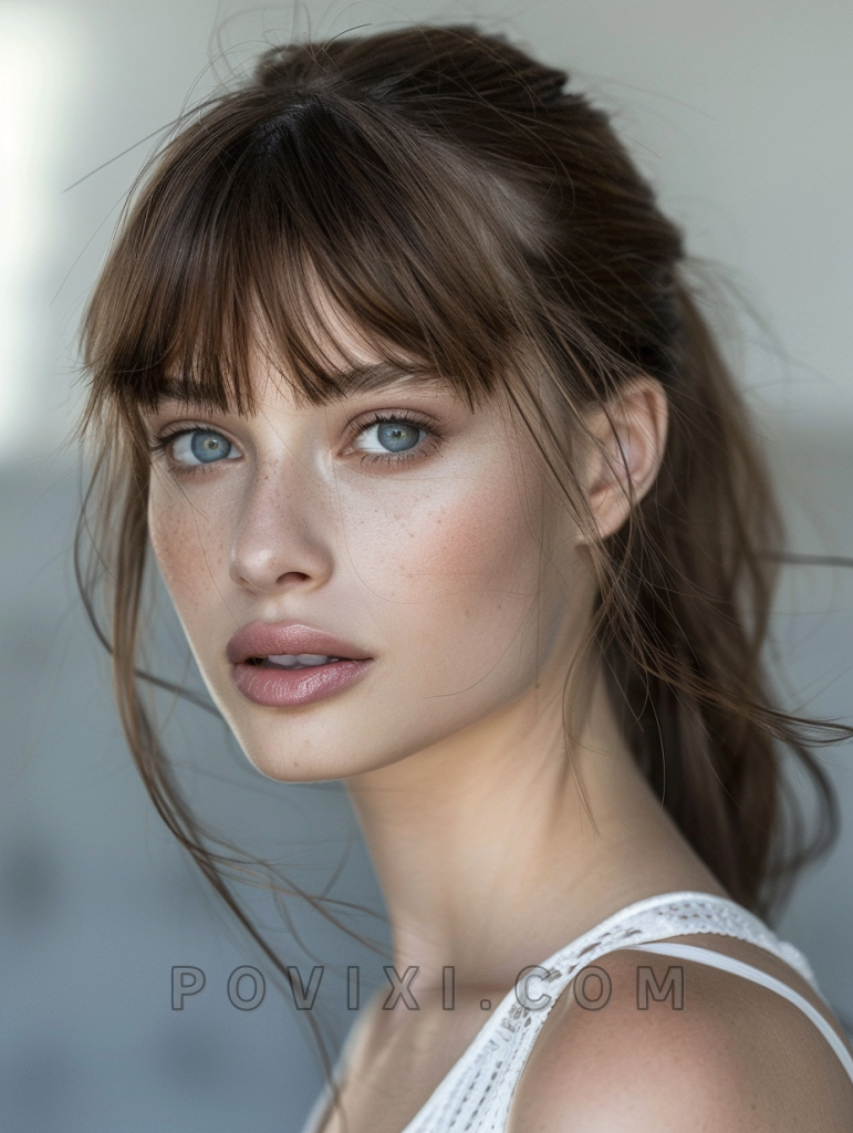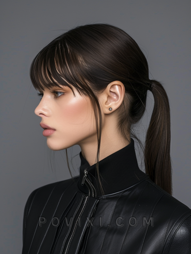 Adding bangs to your low sleek ponytail can create a youthful and playful appearance. This style is ideal for casual outings and can be adapted for more formal occasions. It works well with most face shapes, particularly oval and heart-shaped faces, and can help frame the face beautifully.