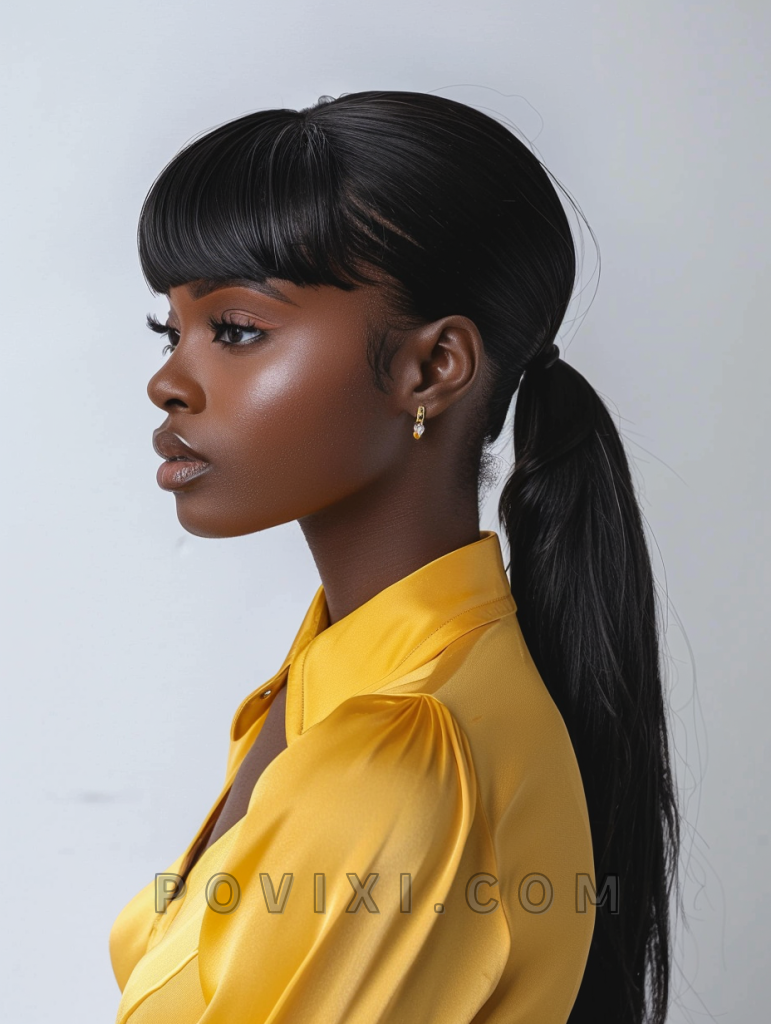 To create this style, start with clean, straightened hair. Attach the weave using your preferred method, whether it’s sewn-in, glued, or clipped. Smooth the natural hair and the weave together, ensuring a seamless blend. Secure the ponytail at the nape of your neck and wrap a small section of hair around the base to hide the hair tie. Use a shine spray to give your hair a glossy finish and maintain the style with a light-hold hairspray.