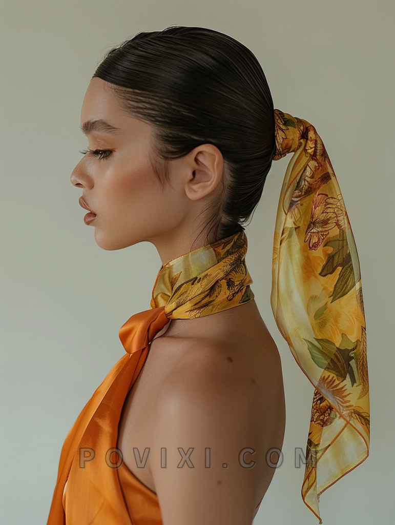 Incorporating a scarf into your low sleek ponytail can add a bohemian and stylish touch. This style is perfect for casual outings and festivals. It works well with most face shapes and adds a colorful and trendy detail to your look.