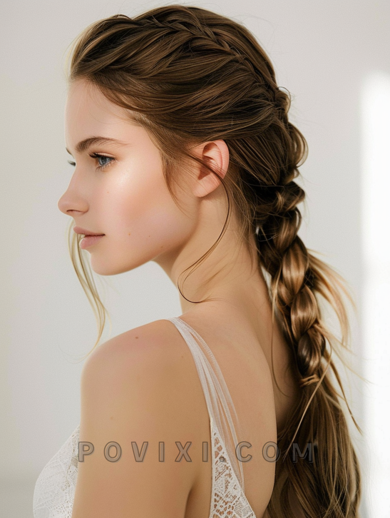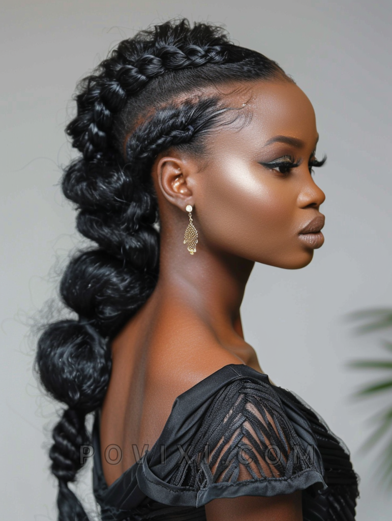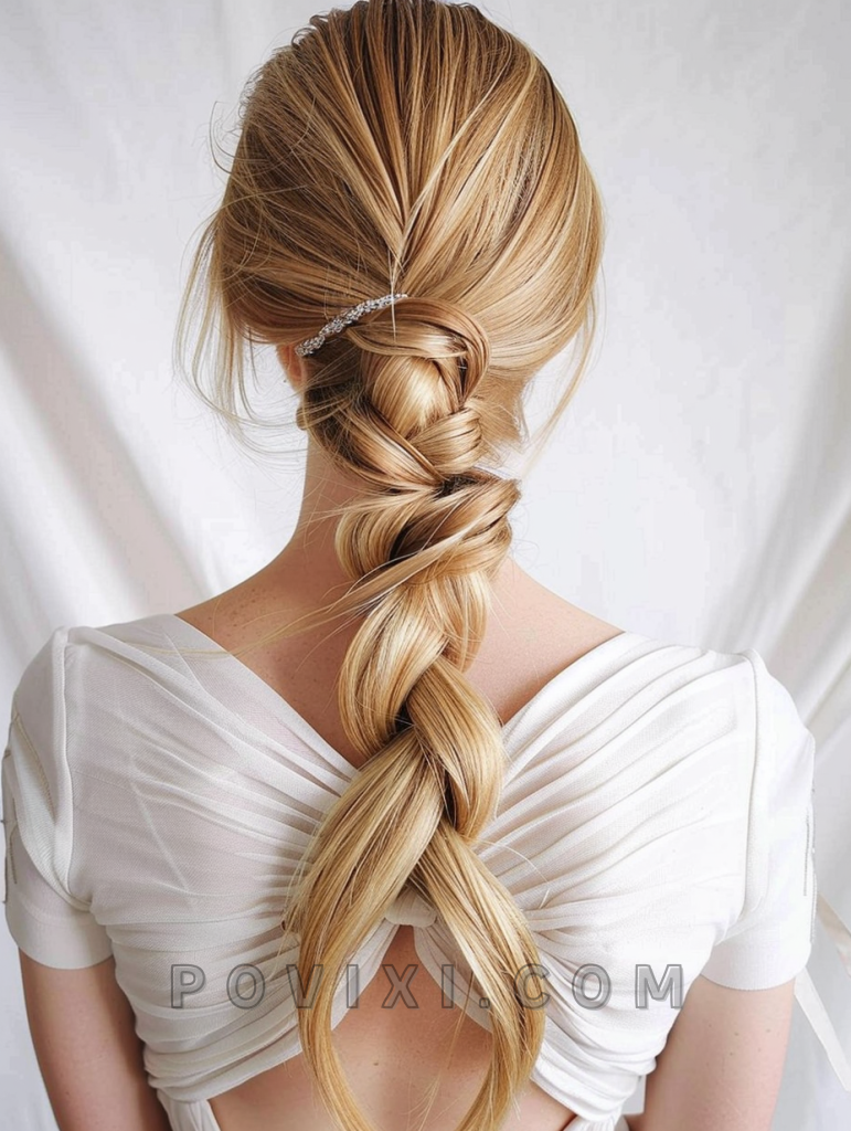 The twisted crown adds a regal and sophisticated touch to the low sleek ponytail. This style is perfect for formal events and weddings, offering a unique and elegant look. It suits most face shapes, particularly oval and heart-shaped faces, highlighting your features beautifully.