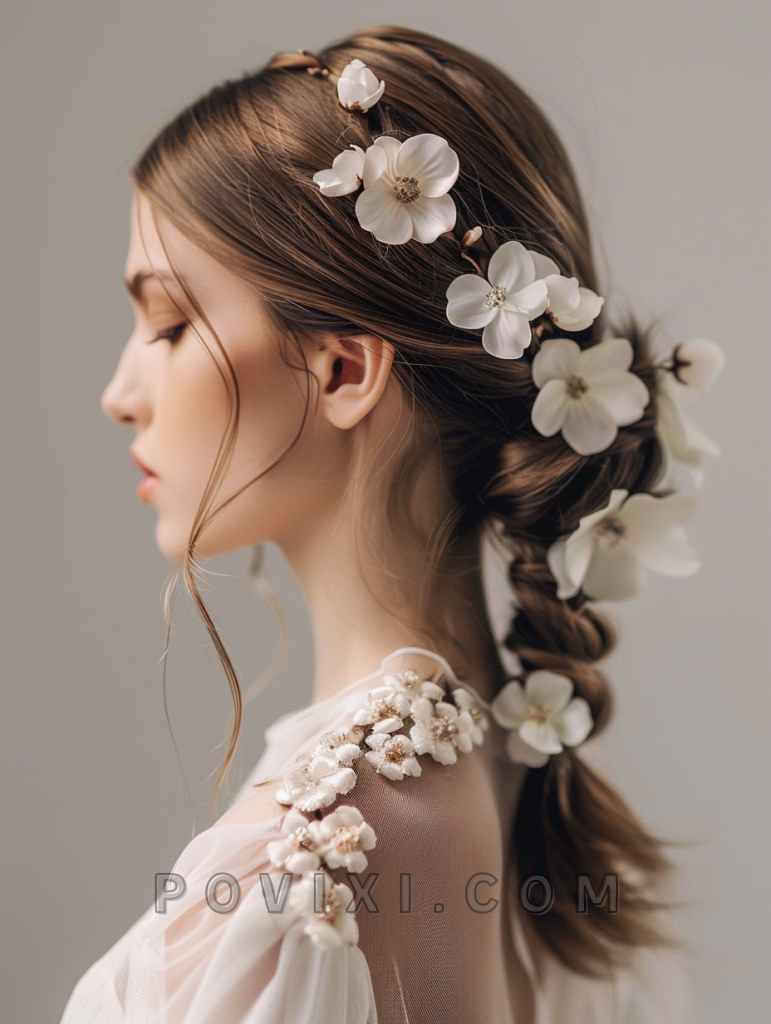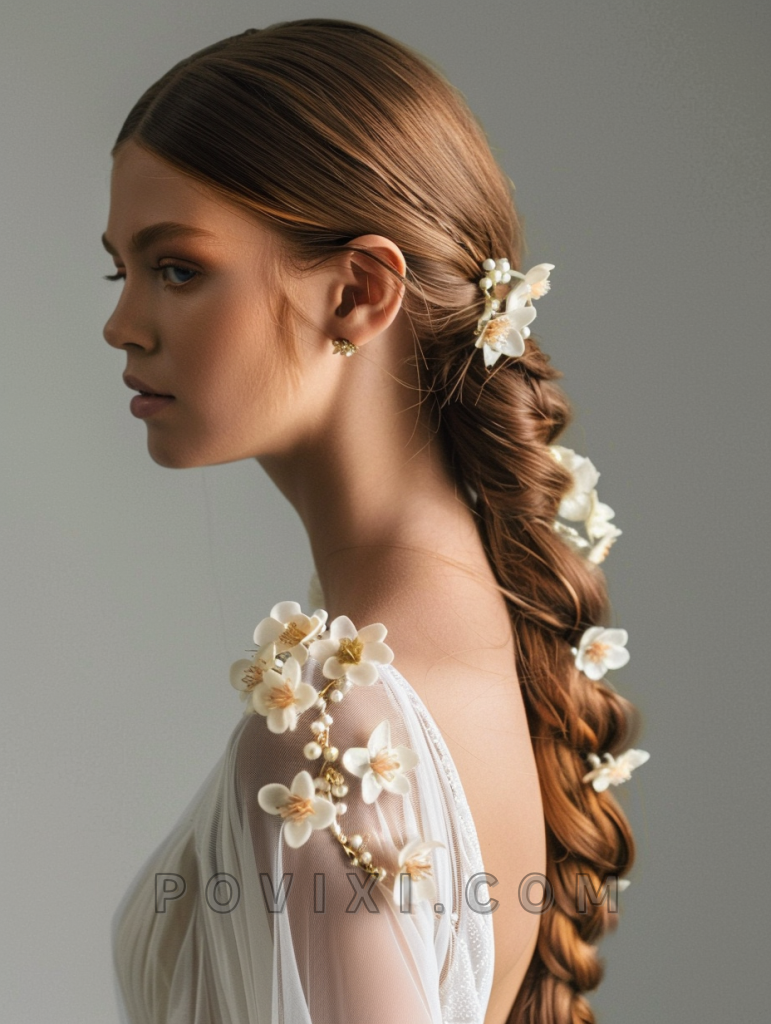 Smooth your hair into a low ponytail at the nape of your neck and secure it with a hair tie. Attach small flowers or floral pins along the length of the ponytail or at the base for a beautiful effect. Use a shine spray to enhance the sleekness and a light-hold hairspray to maintain the style.