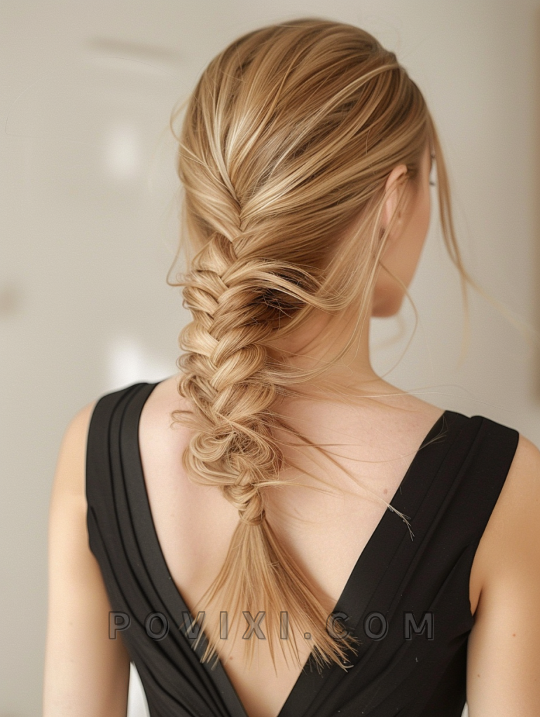Smooth your hair into a low ponytail at the nape of your neck and secure it with a hair tie. Split the ponytail into two sections and create a fishtail braid by alternately crossing small sections of hair from each side over to the opposite section. Secure the end of the braid with a hair tie. Use a shine-enhancing spray for a glossy finish and a light-hold hairspray to keep the style in place.