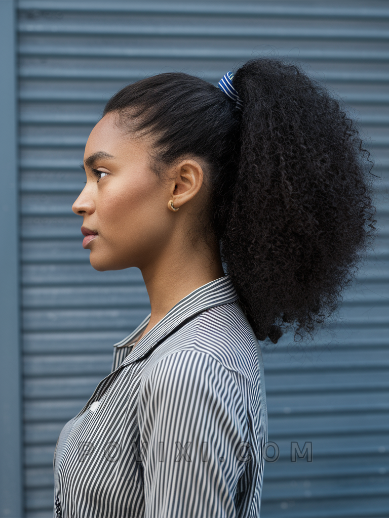 For a bold and textured look, the low sleek ponytail with afro kinky hair is a fantastic option. This style is perfect for making a statement and is suitable for both casual and formal events. It suits most face shapes and highlights the unique texture of afro kinky hair.