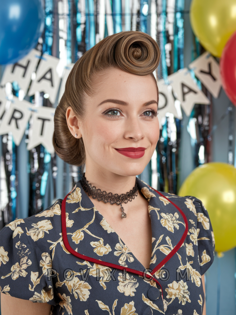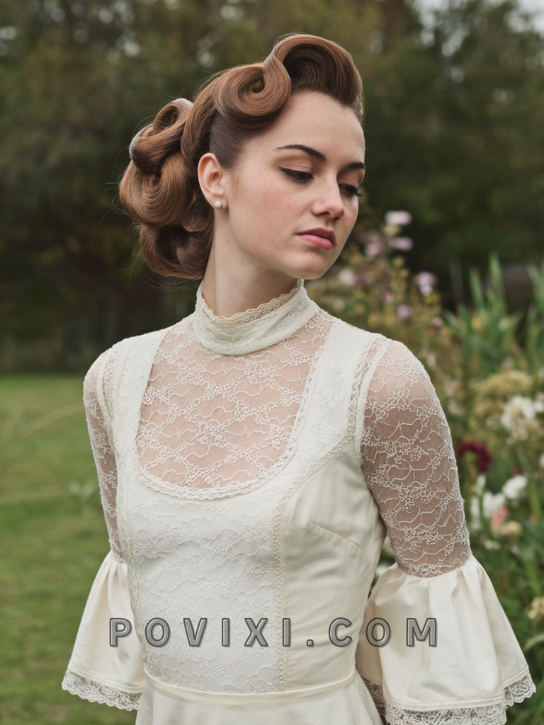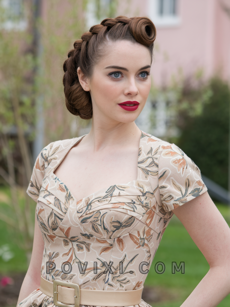 Victory rolls are synonymous with 1940s hairstyles, epitomizing the era’s blend of glamour and practicality. This updo features rolled sections of hair pinned on the top or sides of the head, perfect for weddings, vintage-themed parties, or special occasions. Best suited for long hair or medium length hair, victory rolls can complement any face shape, but they truly shine on heart-shaped or diamond faces. Dark or chestnut-colored hair enhances the structure and elegance of this style.