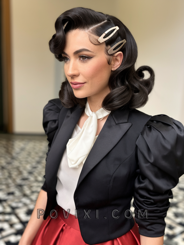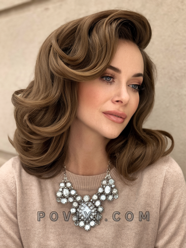 Hollywood waves are a classic symbol of 1940s and 1950s movie star glamor. These deep, shiny waves cascade down the shoulders, making them ideal for formal events, galas, or any occasion where elegance is key. This look is perfect for long hair or medium length hair, especially for those with oval or rectangular face shapes. The shine of these waves enhances brown or dark hair tones beautifully.