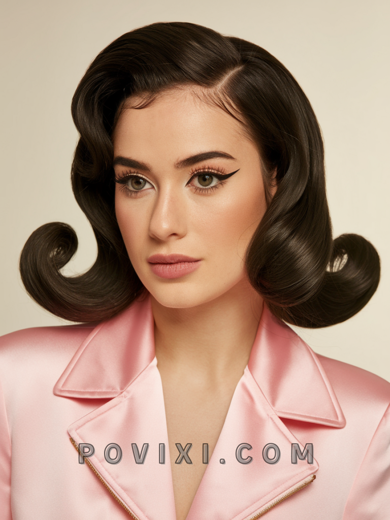 The pageboy haircut is a timeless choice for those looking to capture the polished style of the 1940s and 1950s. Characterized by its sleek, straight hair with curled under ends, it’s perfect for medium length hair. This style suits oval and rectangular face shapes and can highlight dark or dramatic eye makeup. The pageboy is both practical and elegant, making it a great choice for professional settings and vintage-themed gatherings.
