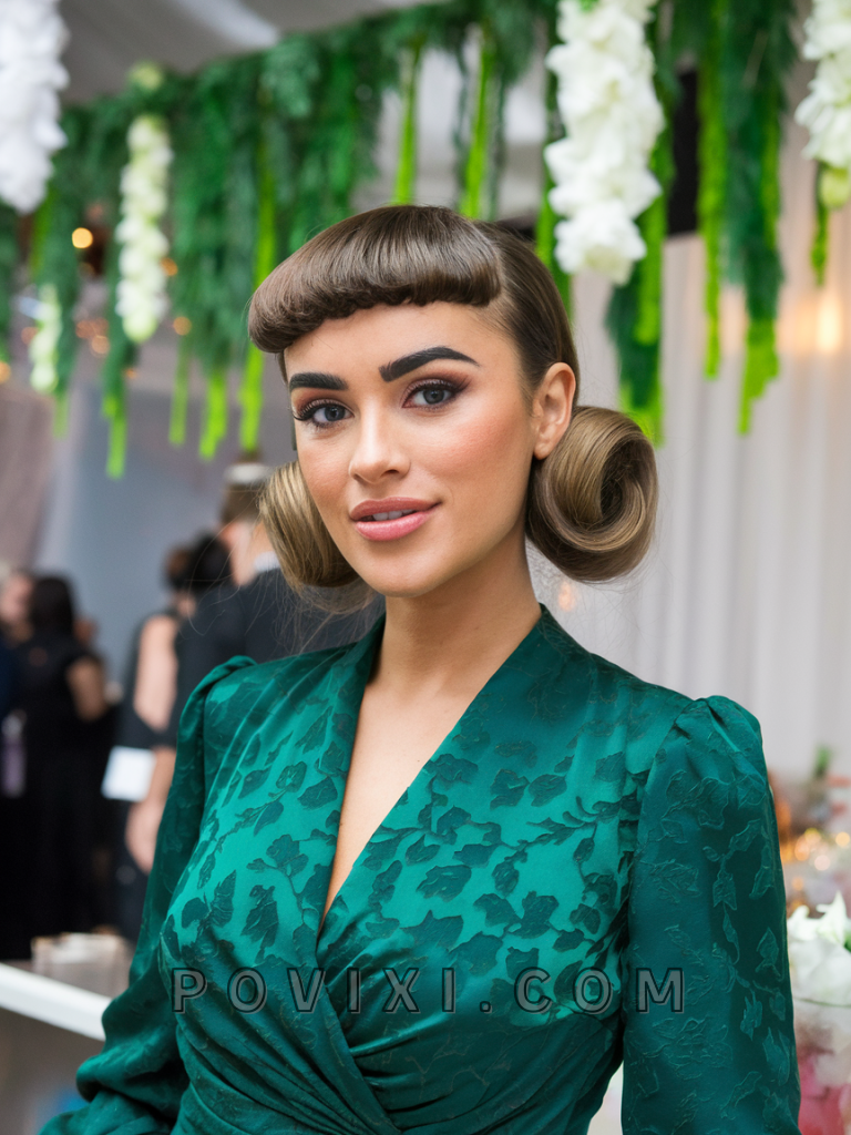 Combining retro flair with modern aesthetics, the updo with curtain bangs creates an effortless, stylish look that works for weddings or dinner parties. This hairstyle highlights the eyes and cheekbones, making it ideal for oval and heart-shaped faces. When paired with natural, glowing makeup, this style is perfect for adding a touch of understated elegance.