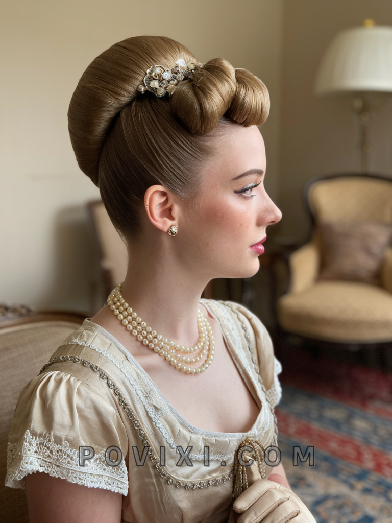 To create this style, gather the hair into a loose twist at the back and pin it securely. Use a teasing comb to add volume at the crown. Set with a light mist of hairspray to maintain the look without stiffness.