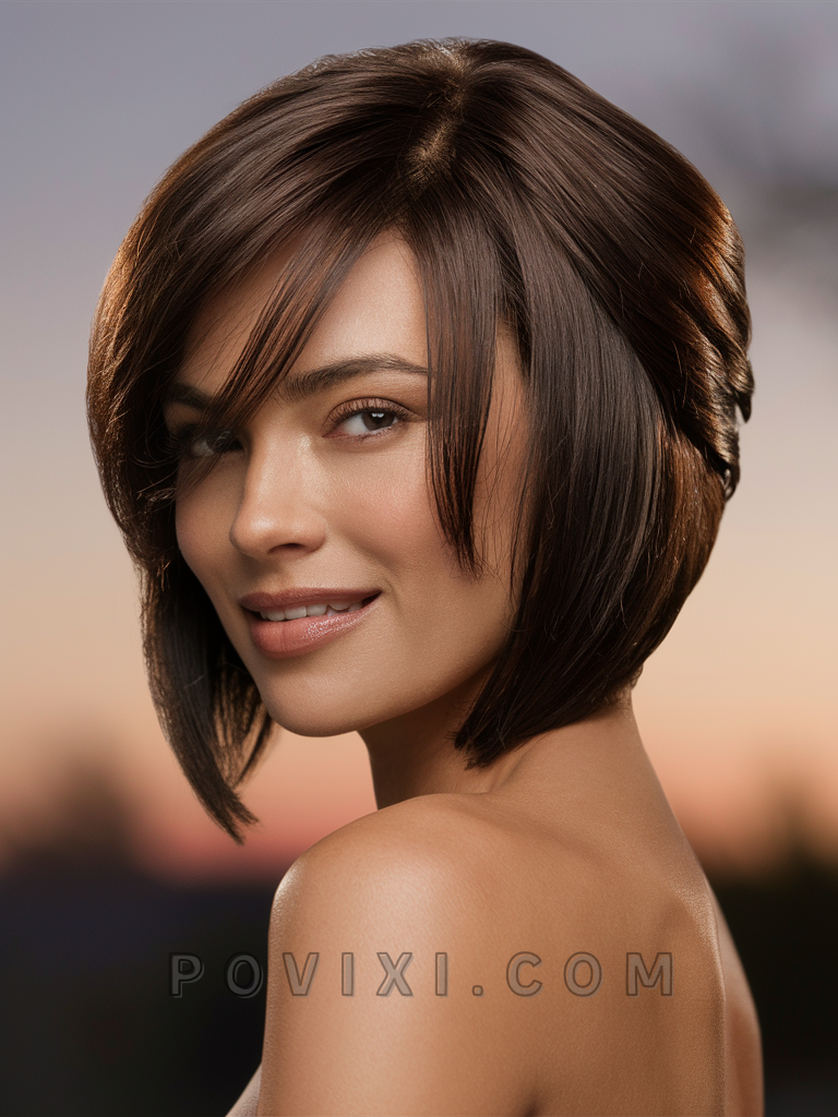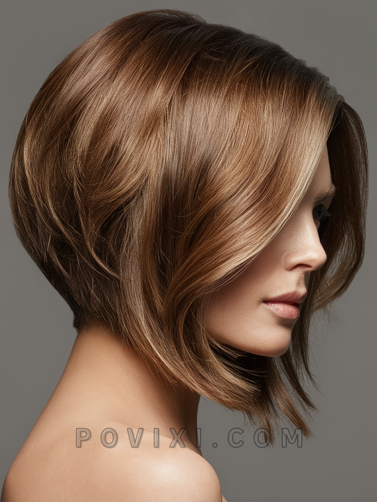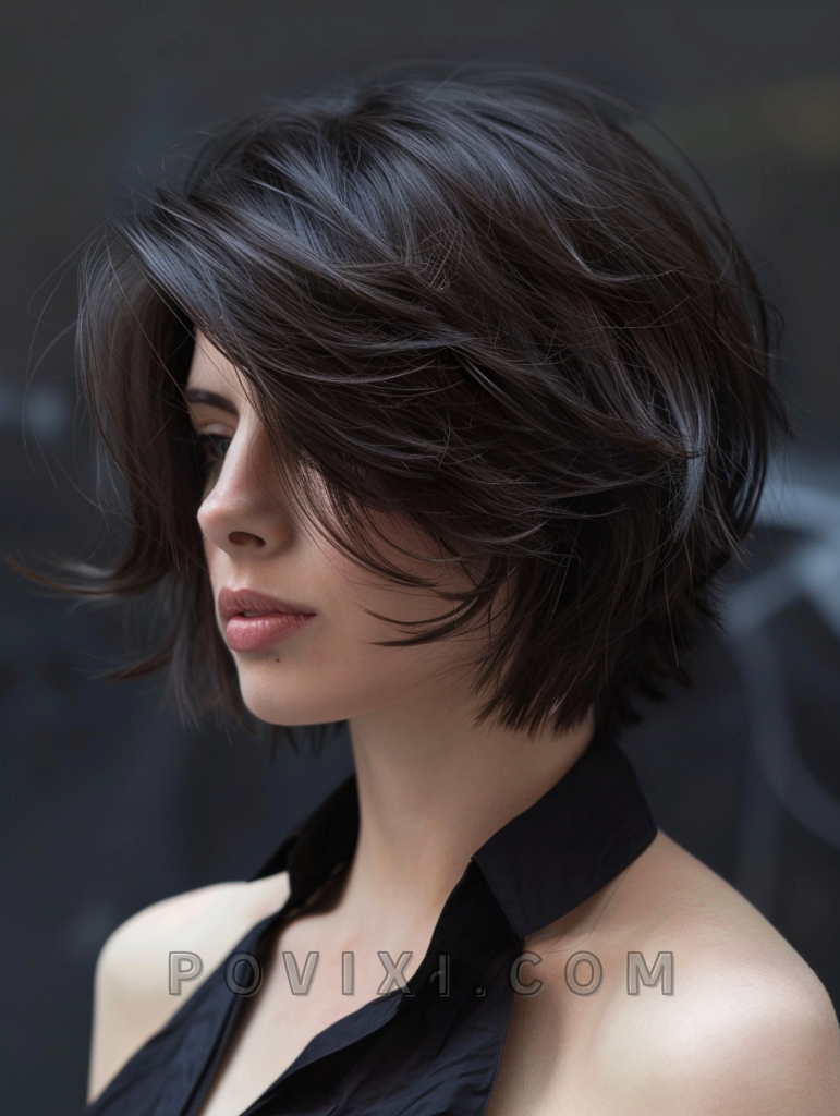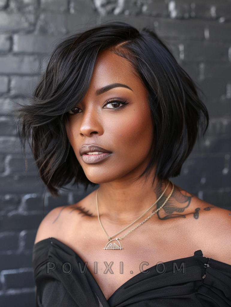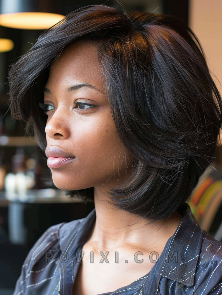 The sleek layered bob with a side part offers a polished and refined appearance, perfect for professional settings or elegant events. This style accentuates sharp, angular face features, making it a great match for rectangular and oval face shapes.