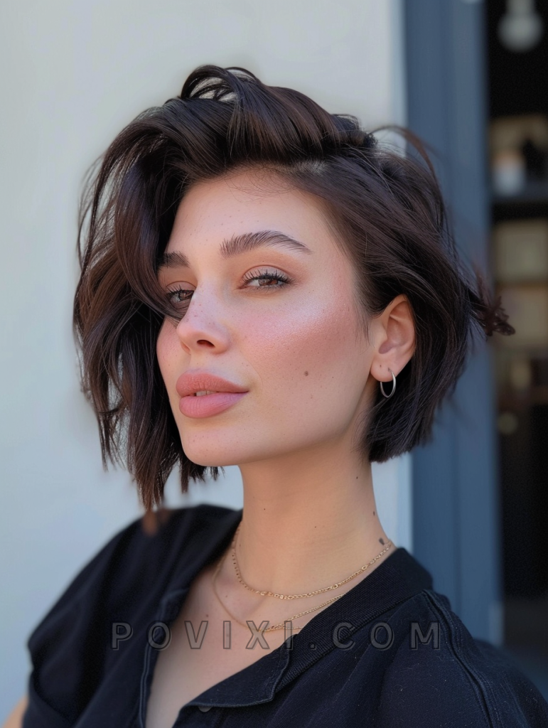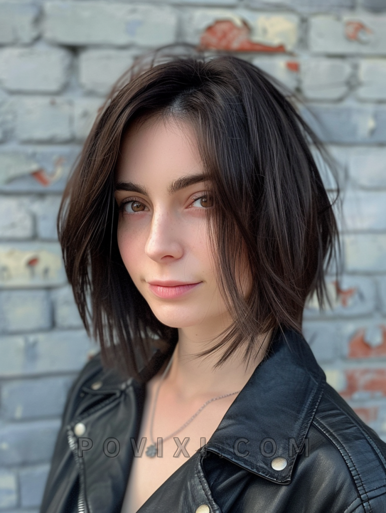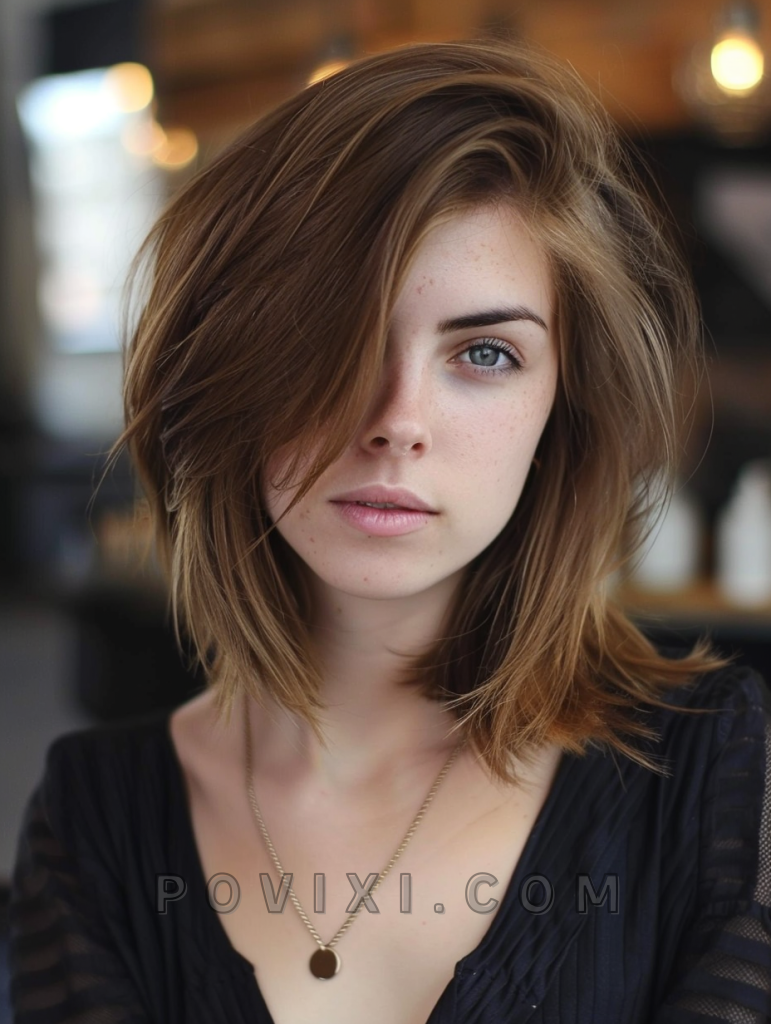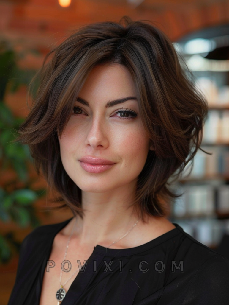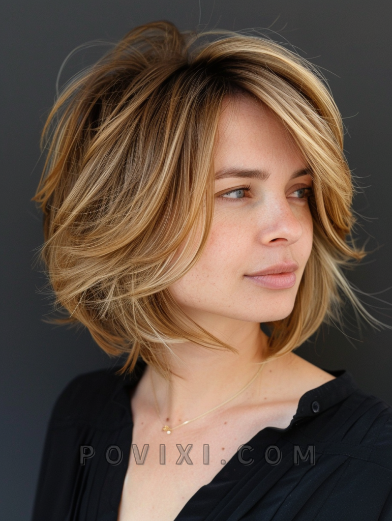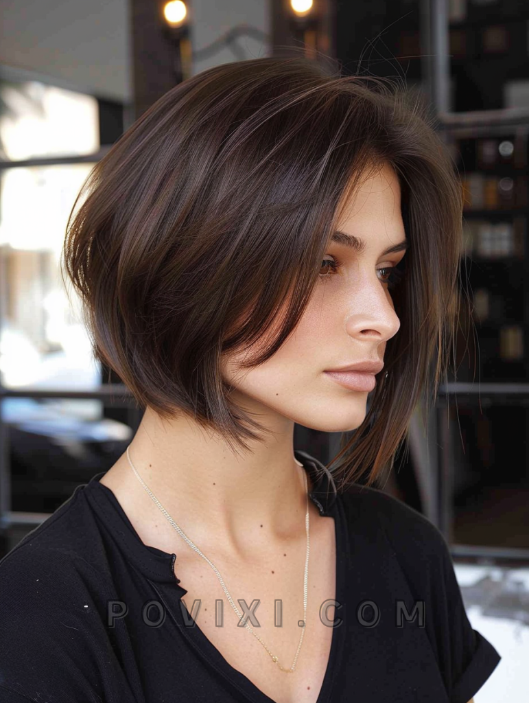 The sleek layered bob with a side part offers a polished and refined appearance, perfect for professional settings or elegant events. This style accentuates sharp, angular face features, making it a great match for rectangular and oval face shapes.