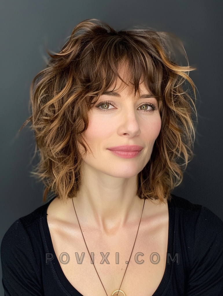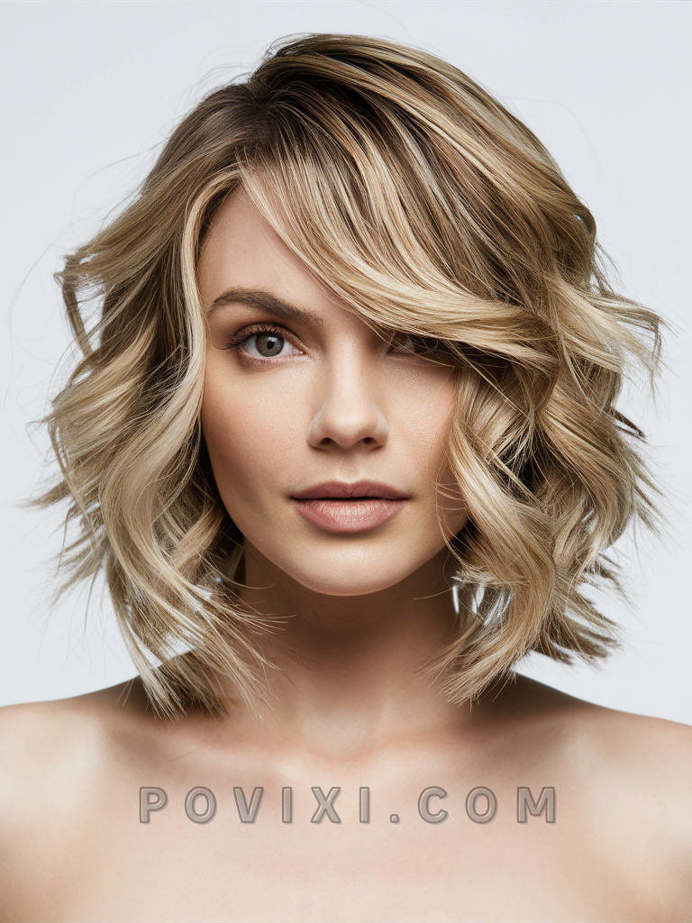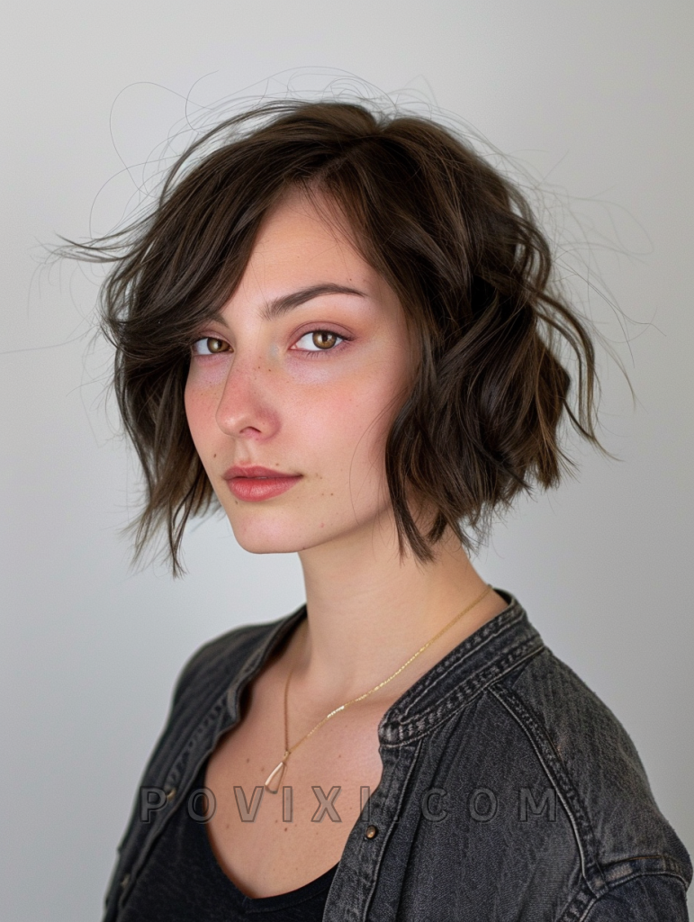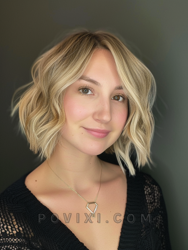The wavy layered bob is specifically flattering for round faces, adding structure and definition. This hairstyle is ideal for a beach vacation or a casual brunch. It works best with light eye colors, enhancing the natural flow and texture of wavy hair.