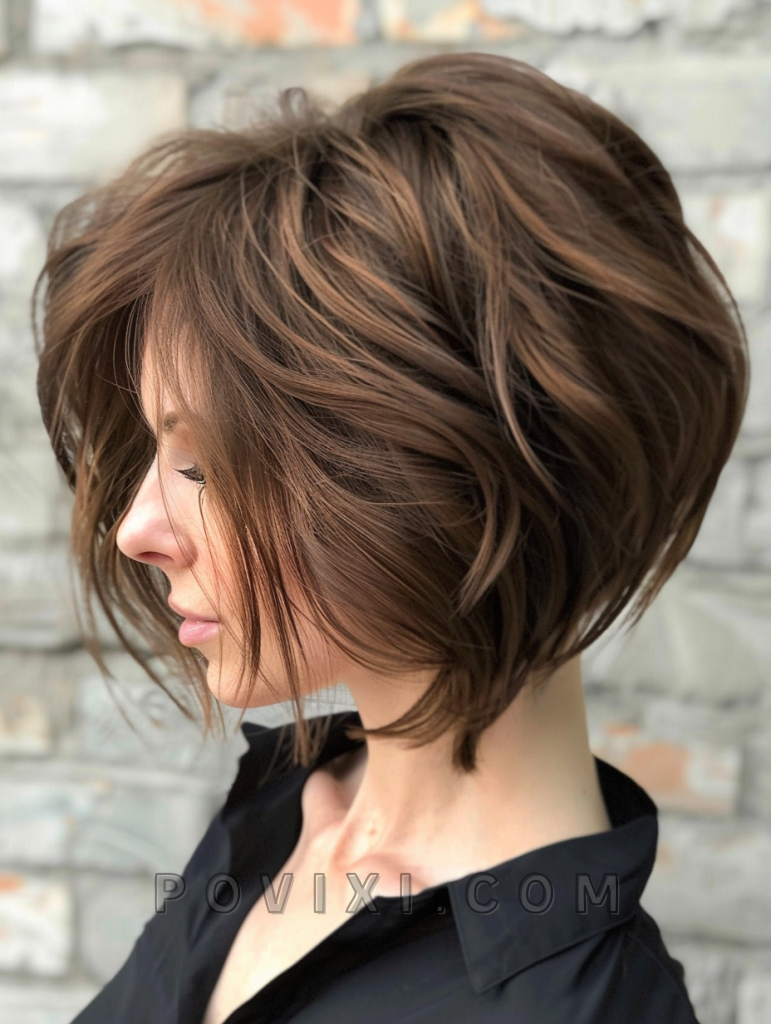 A layered bob with a stacked back adds volume and depth at the back of the head, making it ideal for thin hair. This style provides a fuller look while maintaining an elegant profile, suitable for all ages and particularly flattering for mature women.