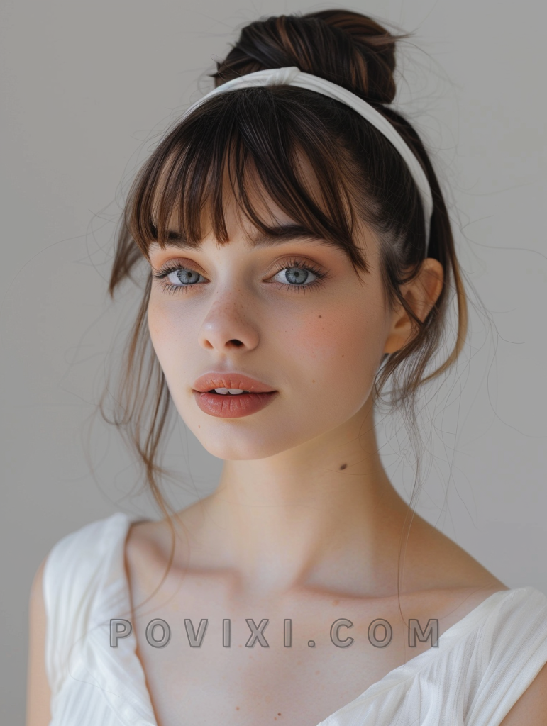Pull your hair back into a neat bun, allowing your bangs to frame your face gently. Choose a headband that contrasts with your hair color for an eye-catching effect. To maintain your bangs’ sleekness, a mini flat iron will do the trick.