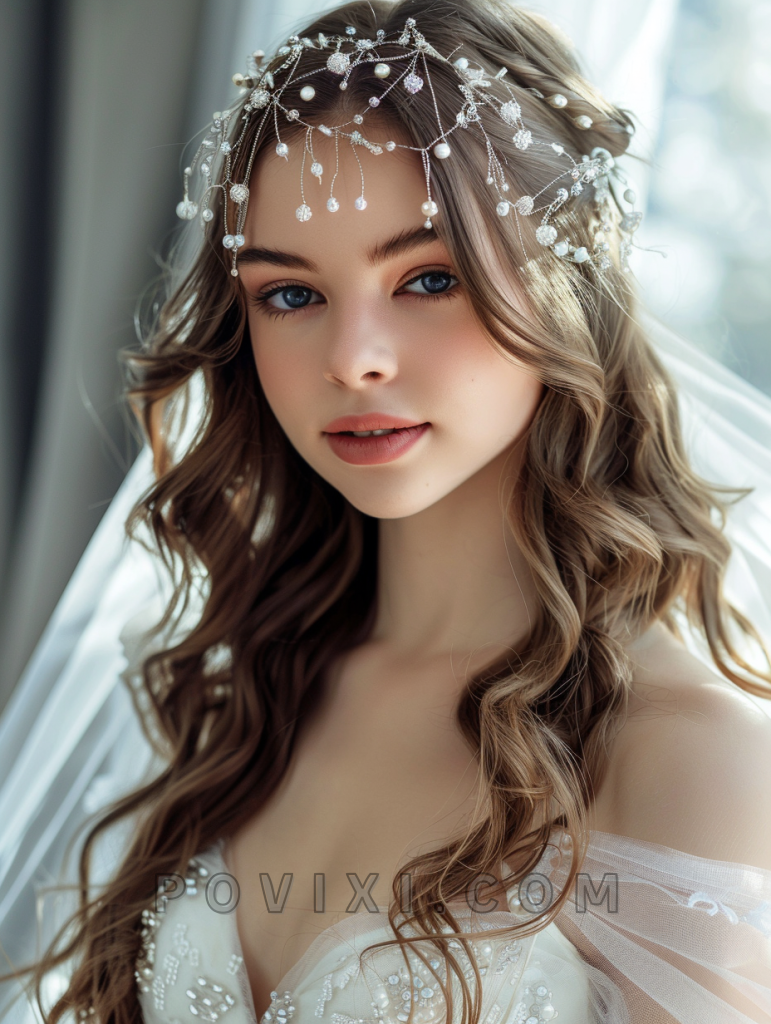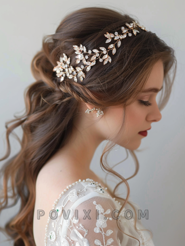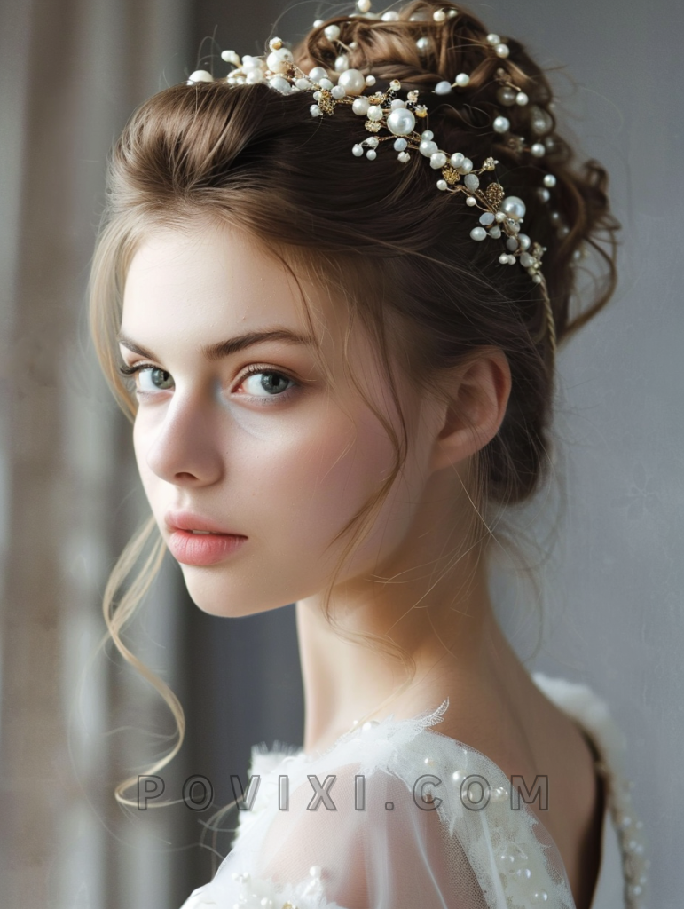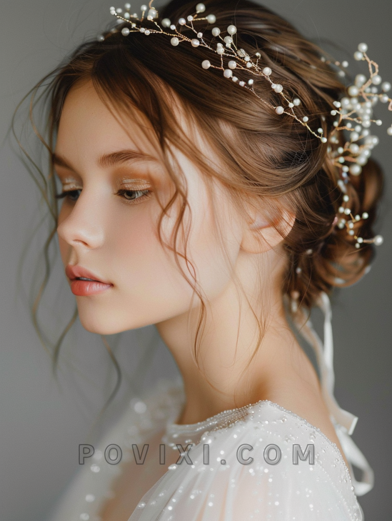 A pearl headband brings a touch of elegance to any wedding hairstyle, especially when paired with a chic updo. This combination works wonderfully for brides with long or medium length hair, offering a classic bridal look that complements a wide range of gowns.